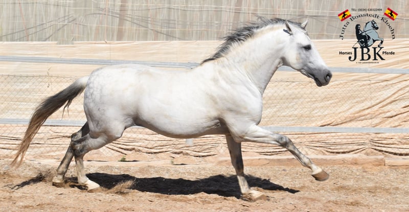 PRE Hengst ORO KEOPS wurde am 03.04.2014 geboren. Er ist ein traumhaft lieber Schatz, der leider aus familiären Gründen abgegeben wird. Er benimmt sich immer anständig, ist überhaupt nicht hengstig und von sehr freundlichem Gemüt. Er enstammt einem erstklassigen Gestüt, wo er eine vernünftige Aufzucht genossen hatte. Ebenso wurde er korrekt ausgebildet. Allerdings hat ihn in den letzten 3 Jahren aus Zeitmangel niemand mehr geritten. Er bekommt also jetzt ein paar Stunden Profiberitt zur Erinnerung. Er hat Bohorquez, La Cartuja, Hierro de bocado und YM in seiner Blutlinie. Ein tolles, barockes Exemplar mit 1,66 m Stockmass, ordentlich ausgemessen.