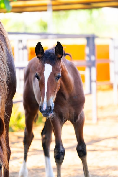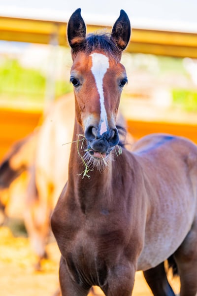 Manovius MV – PRE Colt in Rare Dream Color Rabicano + Pearl Gene Manovius MV is a foal that you cannot overlook – and will not forget. His rare Rabicano color combined with the Pearl gene and an expressive blaze make him a true one-of-a-kind. He is currently the only PRE in the world with exactly this color genetics. But he offers much more than just looks: Manovius is affectionate, cuddly, and seeks closeness to humans. He approaches everything with curious openness and learns quickly – whether it’s haltering or picking up his hooves. Even now, he shows a correct foundation, strong joints, and the harmonious proportions of the old, baroque Spanish type. His final height will be around 165 cm, making him a versatile partner – whether in breeding for special color and type inheritance, at shows as a head-turner, or in leisure activities as a reliable companion. Manovius MV combines special colors, character, and baroque elegance – a young stallion that already has that certain something.