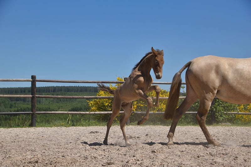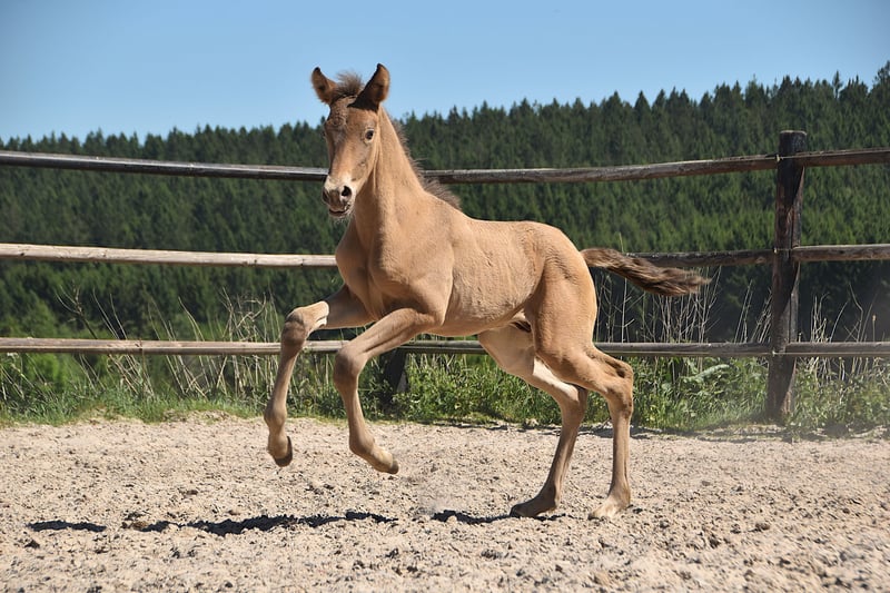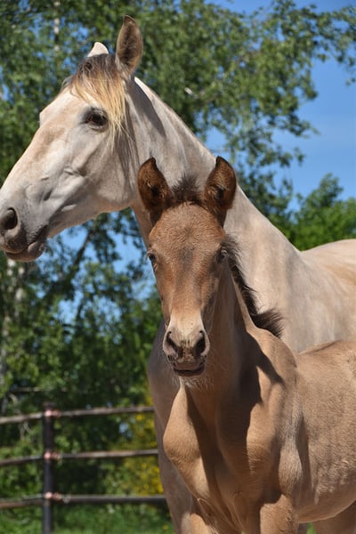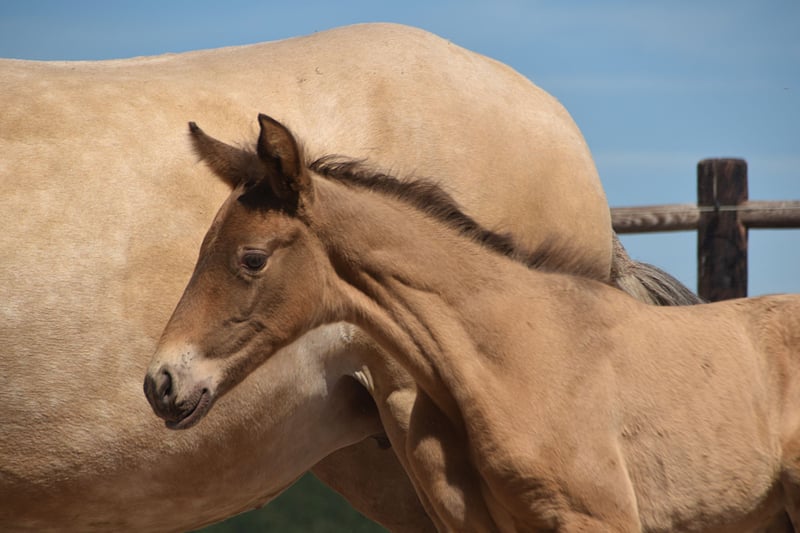 Deze uitzonderlijke hengstveulen is een opvallende dubbele parel (isabelo) PRE, geboren op 1 mei 2025, uit Duquesa CCCLXII en Maestrante PM. Hij is een materne kleinzoon van de beroemde Pearl of Peace EV, een lijn die bekend staat om zijn kwaliteit en aanwezigheid. Zijn vader, Maestrante PM, is onze indrukwekkende dubbele parel hengst, met een hoogte van 1,71 m. Maestrante geeft consequent een stevige botstructuur, expressieve beweging en natuurlijke elasticiteit door aan zijn nakomelingen. Naast zijn fysieke en conformational kwaliteiten, die hem bij uitstek geschikt maken voor dressuur, wordt Maestrante geprezen om zijn gemakkelijke, genereuze temperament in elke situatie. Maestrante PM heeft tweemaal deelgenomen aan het Europese Centraal Kampioenschap, waar hij in 2022 een bronzen medaille won in de hengstenklasse boven de 7 jaar, en in 2023 goud won voor functionaliteit (bereden proef voor hengsten van 7 jaar en ouder). Hij is geregistreerd in het PRE-stamboek en volledig kleur getest. Dit veulen draagt niet alleen zeldzame en gewilde kleurgenetica, maar toont ook oprechte aanleg voor dressuur. Hij vertoont al drie duidelijke, goed gebalanceerde gangen en laat een kalme, nieuwsgierige en attente aard zien. Met zijn uitstekende temperament en veelzijdige vaardigheden zou hij ook perfect geschikt zijn voor buitenritten, werkende equitatie of recreatief rijden.