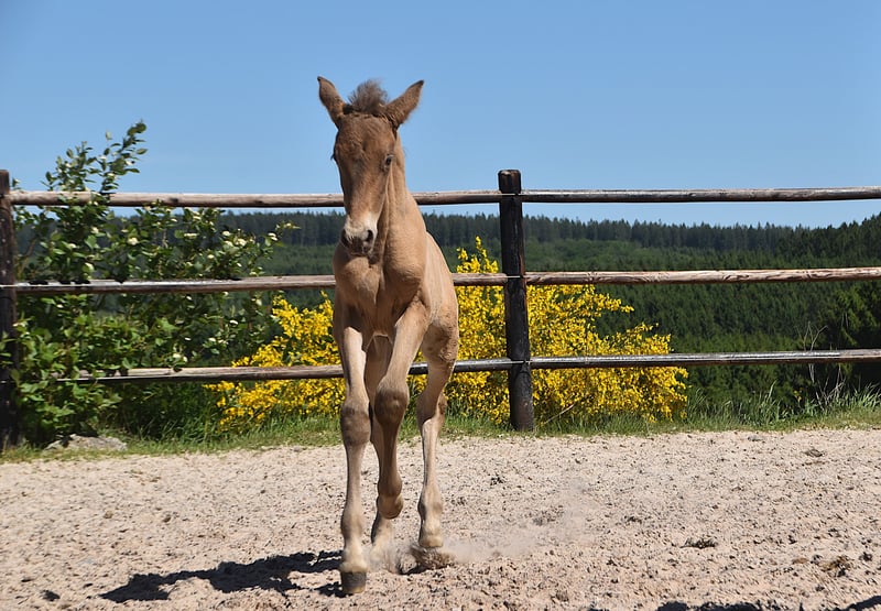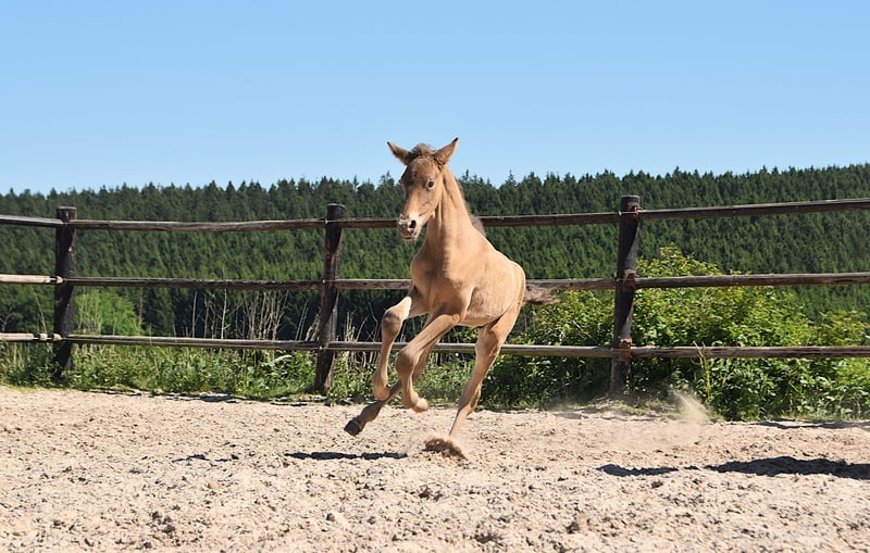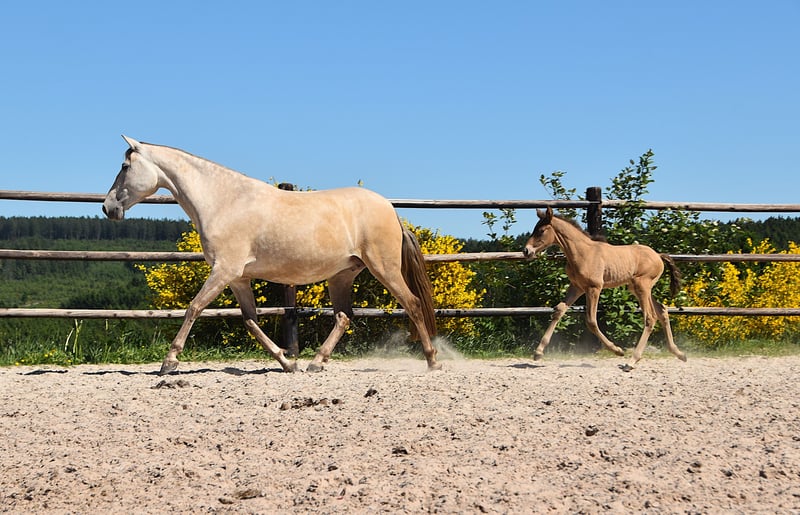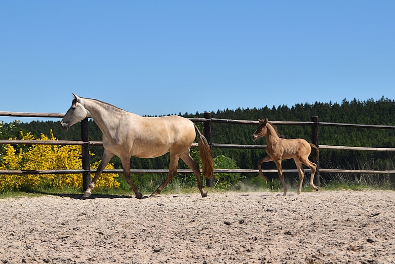 Este ejemplar excepcional es un potro doble pearl (isabelo) PRE, nacido el 1 de mayo de 2025, hijo de Duquesa CCCLXII y Maestrante PM. Es nieto materno de la reconocida Pearl of Peace EV, una línea de sangre conocida por su calidad y presencia. Su padre, Maestrante PM, es nuestro impresionante semental doble pearl, con una altura de 1,71 m. Maestrante transmite de manera constante hueso robusto, movimientos expresivos y elasticidad natural a su descendencia. Además de sus cualidades físicas y conformacionales, que lo hacen ideal para la doma clásica, Maestrante es famoso por su temperamento tranquilo, generoso y fácil de manejar en cualquier circunstancia. Maestrante PM ha competido en dos ocasiones en el Campeonato Central de Europa, obteniendo una medalla de bronce en 2022 en la categoría de sementales mayores de 7 años, y logrando el oro en 2023 en la prueba de funcionalidad (prueba de aptitud para sementales de 7 años en adelante). Está inscrito en el libro genealógico del PRE y cuenta con todas las pruebas de color realizadas. Este potro no solo posee una genética de color rara y deseable, sino que también muestra una auténtica aptitud para la doma clásica. Ya presenta tres pasos claros, equilibrados y bien definidos, y exhibe una naturaleza tranquila, curiosa y atenta. Con su excelente temperamento y habilidades versátiles, sería también ideal para paseos, doma de trabajo o equitación de ocio.