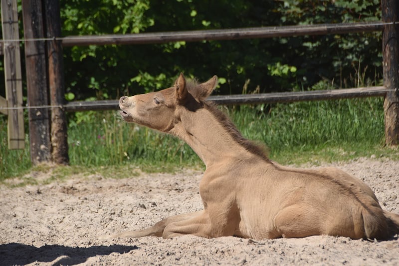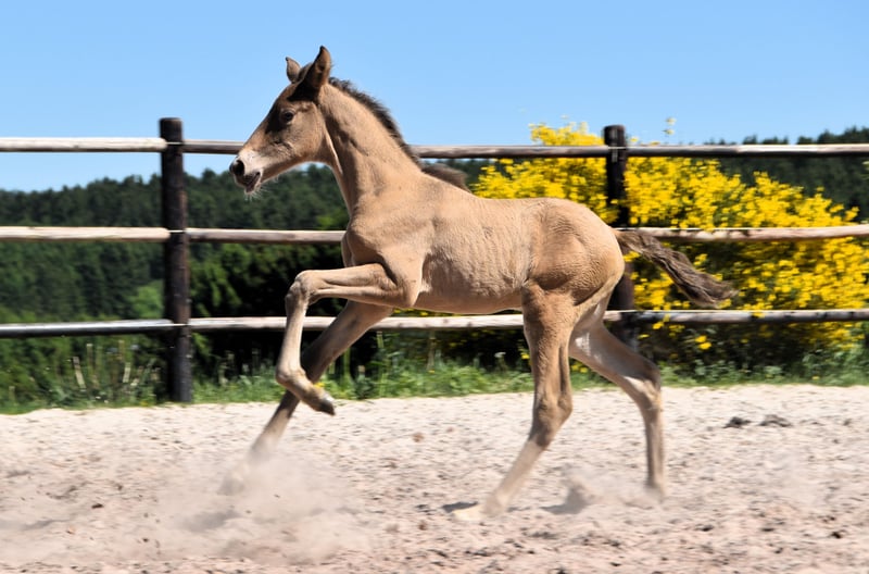 Dieser außergewöhnliche Hengstfohlen ist ein auffälliger Doppelperle (Isabelo) PRE, geboren am 1. Mai 2025, aus Duquesa CCCLXII und Maestrante PM. Er ist ein mütterlicher Enkel des renommierten Pearl of Peace EV, einer Linie, die für Qualität und Präsenz bekannt ist. Sein Vater, Maestrante PM, ist unser beeindruckender Doppelperle-Hengst, der 1,71 m groß ist. Maestrante gibt seinen Nachkommen konstant substanzielle Knochen, ausdrucksvolle Bewegungen und natürliche Elastizität weiter. Neben seinen physischen und konformationellen Qualitäten, die ihn ideal für die Dressur geeignet machen, ist Maestrante für sein unkompliziertes, großzügiges Temperament in jeder Situation bekannt. Maestrante PM hat zweimal an der Europäischen Zentralmeisterschaft teilgenommen und 2022 eine Bronzemedaille in der Klasse der Hengste über 7 Jahren gewonnen sowie 2023 Gold für Funktionalität (gerittene Prüfung für Hengste ab 7 Jahren) gewonnen. Er ist im PRE-Stutbuch eingetragen und vollständig farbgenetisch getestet. Dieses Fohlen trägt nicht nur seltene und begehrenswerte Farbgenetik – es zeigt auch eine echte Begabung für die Dressur. Es zeigt bereits drei klare, gut ausbalancierte Gangarten und demonstriert eine ruhige, neugierige und aufmerksame Natur. Mit seinem ausgezeichneten Temperament und seinen vielseitigen Fähigkeiten wäre er auch perfekt für Ausritte, Working Equitation oder Freizeitreiten geeignet.