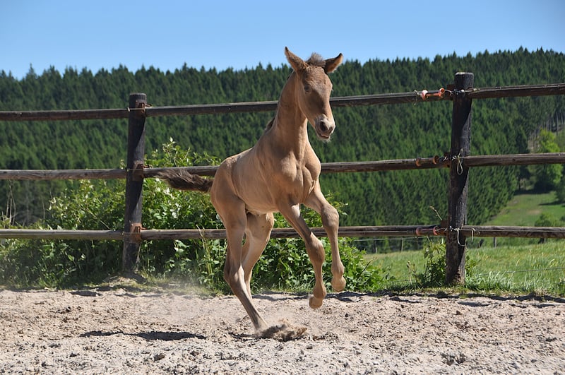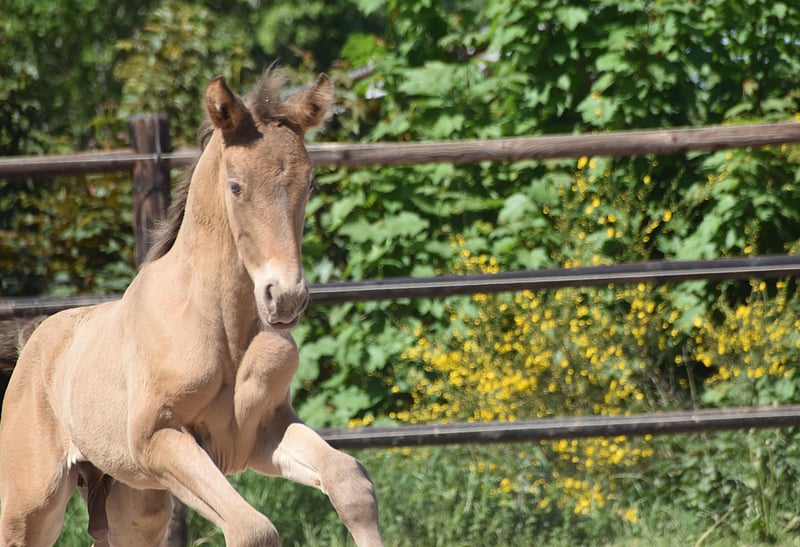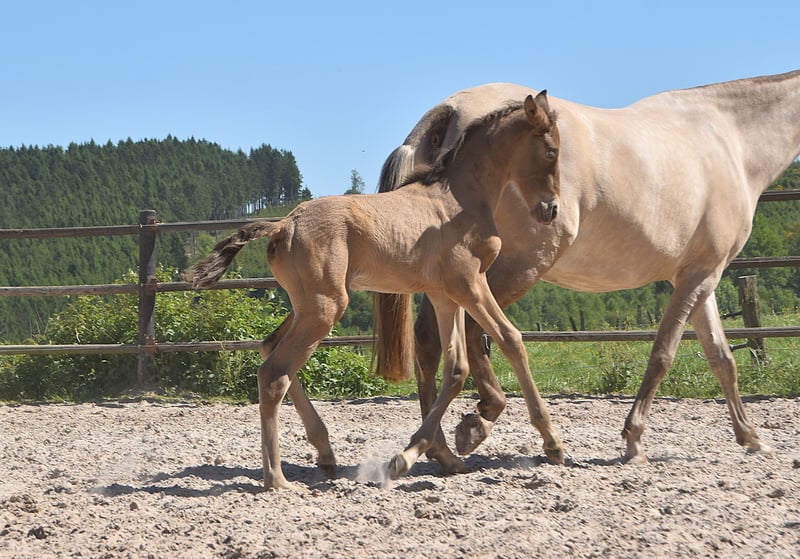 Ce poulain exceptionnel est un double perle frappant (isabelo) PRE, né le 1er mai 2025, issu de Duquesa CCCLXII et Maestrante PM. Il est un petit-fils maternel de la célèbre Pearl of Peace EV, une lignée connue pour sa qualité et sa présence. Son père, Maestrante PM, est notre impressionnant étalon double perle, mesurant 1,71 m. Maestrante transmet constamment une ossature substantielle, un mouvement expressif et une élasticité naturelle à sa descendance. Au-delà de ses qualités physiques et morphologiques, qui le rendent idéal pour le dressage, Maestrante est célébré pour son tempérament décontracté et généreux dans toutes les circonstances. Maestrante PM a participé deux fois au Championnat Central Européen, remportant une médaille de bronze en 2022 dans la catégorie des étalons de plus de 7 ans, et gagnant l'or en 2023 pour sa fonctionnalité (test monté pour les étalons âgés de 7 ans et plus). Il est enregistré dans le livre généalogique PRE et entièrement testé pour la couleur. Ce poulain ne porte pas seulement des gènes de couleur rares et désirables, il montre également une véritable aptitude pour le dressage. Il affiche déjà trois allures claires et bien équilibrées, et démontre une nature calme, curieuse et attentive. Avec son excellent tempérament et ses capacités polyvalentes, il serait également parfaitement adapté pour le hacking, l'équitation de travail ou les balades de loisir.