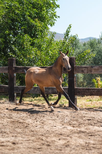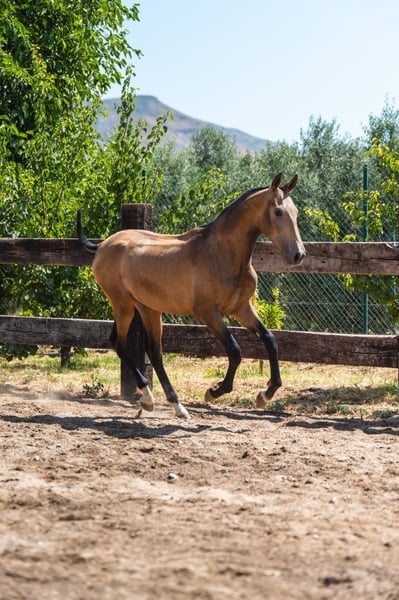 Jonge PRE-hengst, geboren in maart 2024. Buckskin vacht en momenteel 1,65 m op de withers. Uitstekend van aard met een zeer zachtaardig en rustig karakter. Hij is gewend aan kinderen en honden.