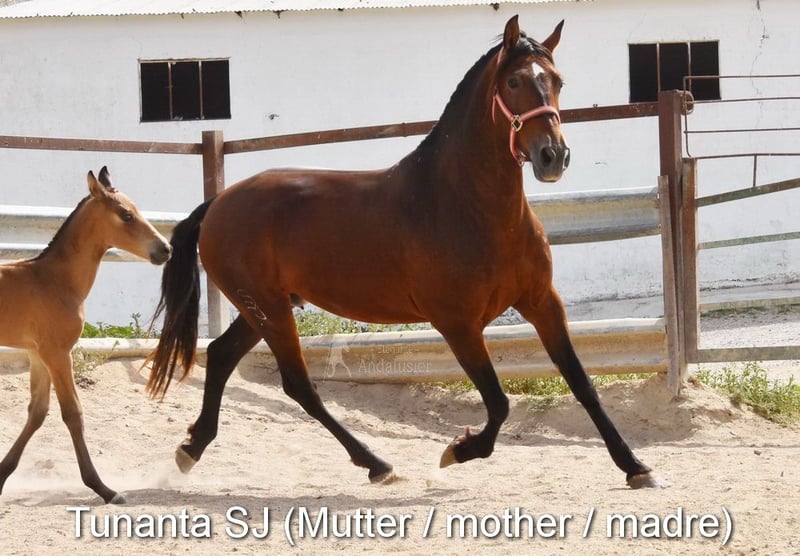 Spokojny charakter, ciekawski, surowy, stoi na zewnątrz z innymi młodymi ogierami, dobry ruch i rodowód, wyjątkowe umaszczenie, PRE Bayo Perla z papierami, rodowód: Antares, Paco Marti, Señorio de Bariain, Cardenas, Opa Karateka i Uropa Gaucho są kwalifikowane. www.elegante-andalusier.com