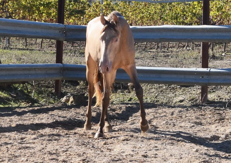 cher caractère calme, curieux, brut, est dehors avec d'autres jeunes étalons, bonnes allures et origines, robe spéciale, PRE Bayo Perla avec papiers, origines : Antares, Paco Marti, Señorio de Bariain, Cardenas, Opa Karateka et Uropa Gaucho sont qualifiés www.elegante-andalusier.com