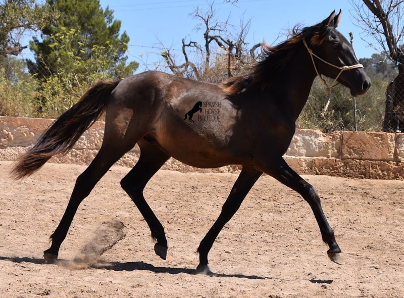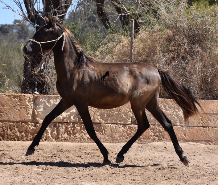 This PRE stallion (Andalusian with ANCCE breed certificate), born 04/2023, is still a little surprise in terms of color! He is registered by the ANCCE as a black stallion, but also shows signs of a dark dun. Since the color test was not done and he is the son of a Perlino, he will either be smoky black or a dark buckskin. In any case: beautiful! And for all those who don't want to be surprised, the color analysis can of course be ordered ;) The young man will not only surprise you with his color, but also with his movement! His long legs sweep across the arena and he really enjoys trotting. He is absolutely fearless and cool - which was a challenge to send him for good photos, but a great representation of his character. At some point you become a big, strong man, so you have to have the courageous character to match. He stands outside 24 hours a day in the company of other boys and is therefore well socialized and hardened. His pedigree, apart from the many special colors such as Perlino, dun and black, is also impressive. He can be traced back to the popular Mejorante stallion Remache XIII and Escalerablut can also be found in his genes. His expected final height is around 160cm. A very cool youngster with great qualities at a very fair price. His location is Mallorca. There is the possibility of leaving him with the breeder for longer. Videos and pedigree available on request. I would be happy to organize an AKU, transport or even your trip if you come to see him in person. Details can be found on my website or in conversation. Saludos from Spain