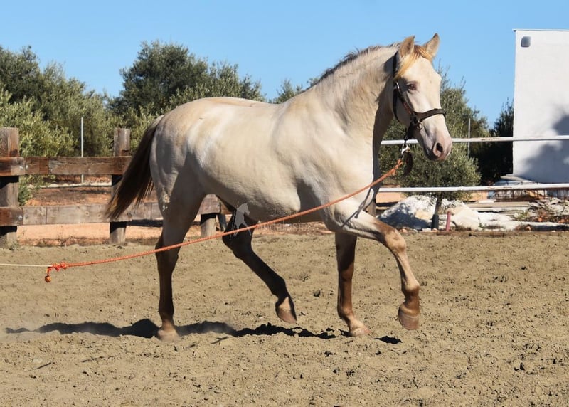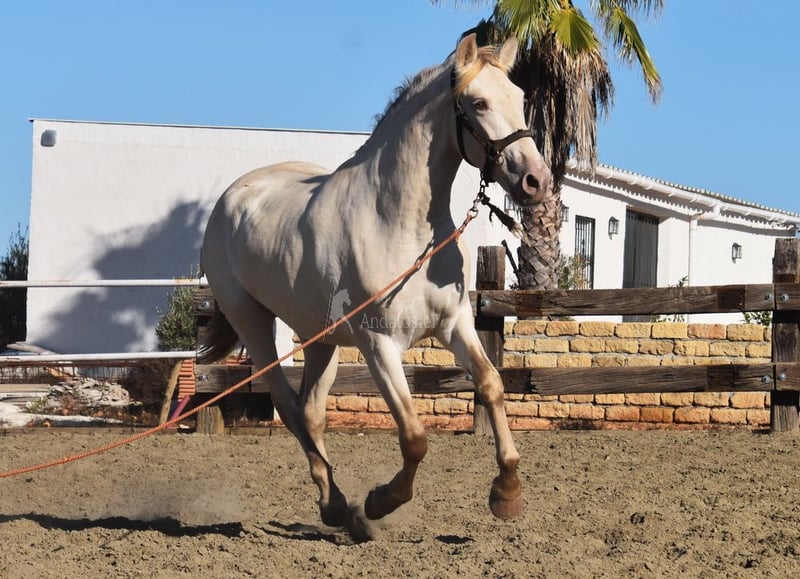 lieber Charakter, roh, wurde vor Kurzem aufgestallt, groß, barock, gute Bewegungen und Abstammung, spezielle Farbe, Bayo Perla mit PRE Papieren, Abstammung: Torreluna, Millan Herce, Ganadería Antares, Yeguada Militar, hat mehrere qualifizierte Vorfahren www.elegante-andalusier.com
