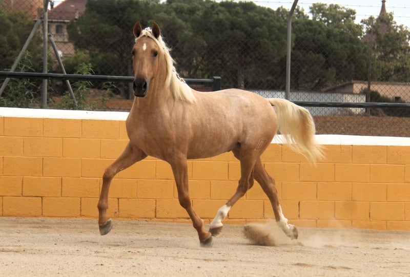 Deze prachtige PRE-hengst in een speciale palomino-kleur zoekt zijn hartsmens. Hij straalt warmte en charme uit en beschikt over prachtige gangen. Karaktermatig is hij een heel lieve, zeer open en beleefde hengst. Hij is 3 jaar oud en momenteel ongeveer 1,59 m hoog. Als volledig uitgegroeid schatten we hem op circa 1,65 m. Hij wordt momenteel voorbereid op het zadel, wat hij heel lief en rustig doet. In de toekomst kunnen we ons hem voorstellen in veel disciplines, zowel in de dressuur, voor working equitation, shows, de fokkerij of gewoon als recreatiepartner. Hij komt uit een uitstekende fokkerij. Zijn jeugd heeft hij doorgebracht in een grote kudde met merries en hun veulens op de wei, en op ongeveer 8 maanden leeftijd is hij van zijn moeder gescheiden om zich te ontwikkelen in een jongehengstenkudde. Nu staat hij op stal, zodat hij ook al gewend is aan de box. Er zijn al röntgenfoto’s zonder afwijkingen beschikbaar. Indien gewenst, kan hij ook nog ter plaatse in Spanje gecastreerd worden. Locatie: Barcelona, Spanje. Een kennismaking in Spanje is mogelijk, en het transport kan gemakkelijk geregeld worden.
