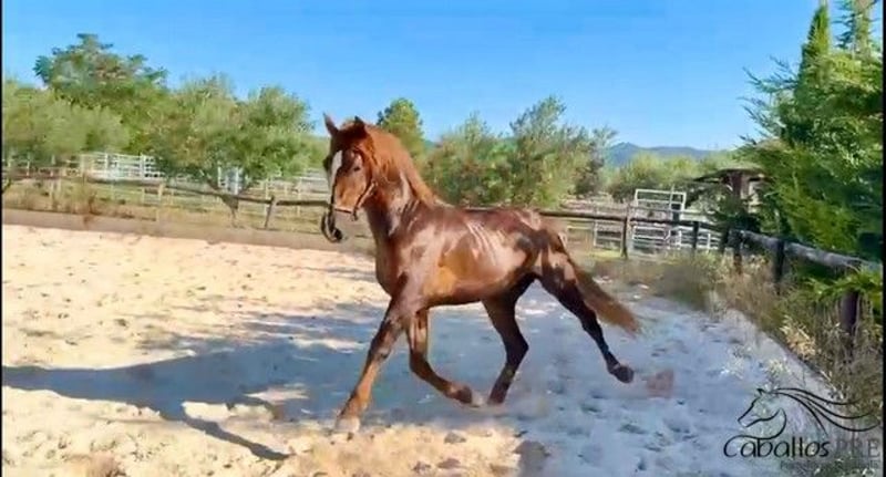 This beautiful chestnut stallion not only impresses with his wonderful presence but also with his equally great character and excellent pedigree. He was born in 05/2022 and currently stands at approximately 1.62 m tall. He is currently being lunged in a relaxed manner with saddle and side reins. He is doing a great job here, responding very kindly and having a lot of fun with the work. Pedigree: Centurion - Lovera - Yeguada Militar - Escalera and Lazo Diaz He has great basic gaits and, with appropriate training, is very interesting for Classical Dressage. He could be gelded upon request. For more information, please feel free to call us. Anonymous inquiries or inquiries with just "What is the price" or "send videos" will not be answered. If you are seriously interested, please just give us a call. Viewing is, of course, possible by appointment. Transportation can be organized worldwide.