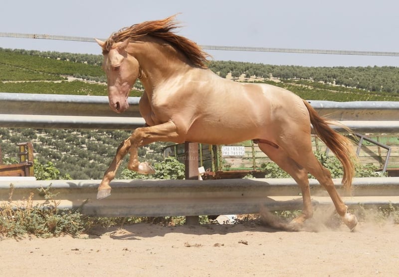 leuk karakter, nieuwsgierig, speels, knuffelig, rauw, gelongeerd, groot, barok, gekeurd, dekhengst, goede bewegingen, speciale kleur, Baya Perla (CrPrl) met papieren, goede röntgenfoto en Piro negatief, afstamming: Antonio Guiral Guarga, Castillo Villafranca, Paco Marti www.elegante-andalusier.com