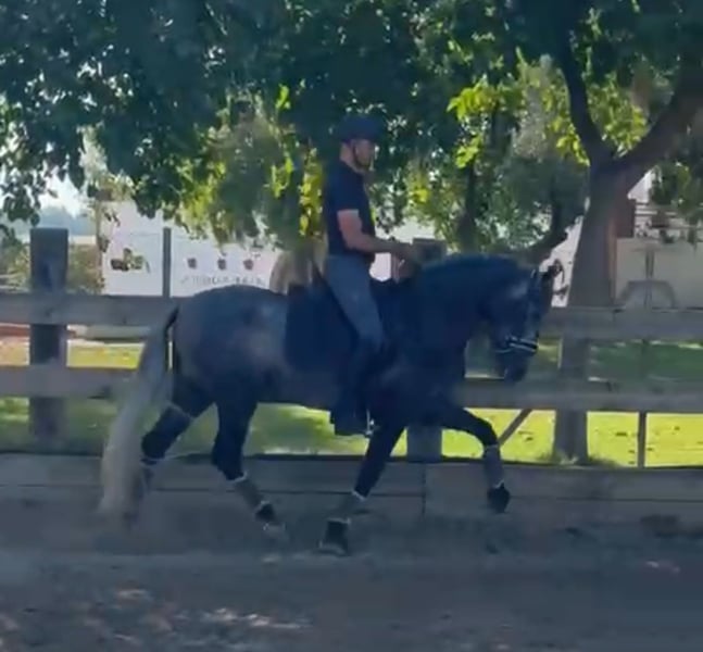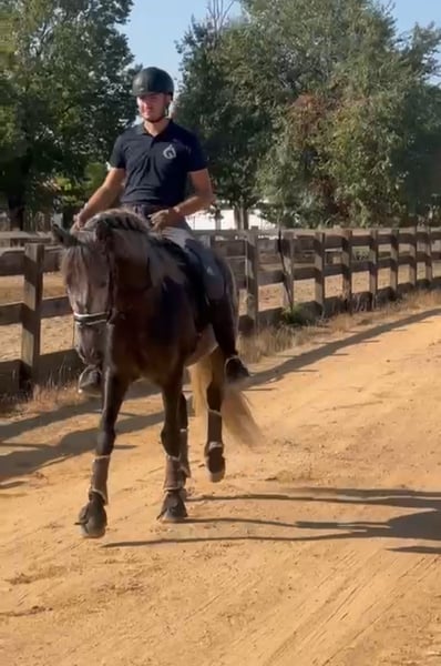 Wunderschöner junger PRE mit vielversprechenden Bewegungen für die höheren Dressuraufgaben. Er besitzt sehr gute Manieren und zeigte beim Anreiten keinerlei schlechtes Verhalten. Er ist äußerst sanft und mutig. Er kennt Ausritte im Gelände und ist offen für Neues, wobei er stets mutig bleibt.
