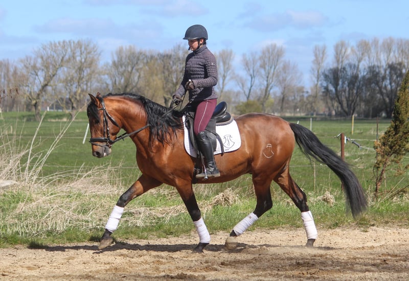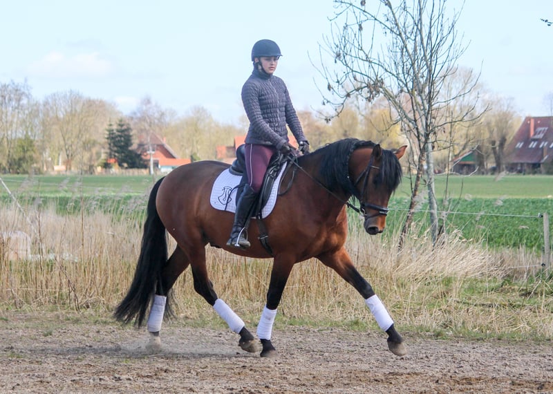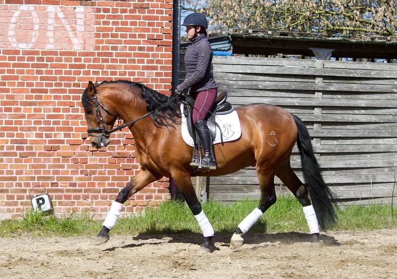Feliciano Ducal ist ein absoluter Hingucker. Er hat einfach diesen besonderen Schmelz, den nur die iberischen Pferde haben. Er bewegt sich elegant und und mit Ausdruck. Seine Grundgangarten sind überdurchschnittlich, der Schritt sehr raumgreifend. Feliciano hat alles, was auch ein gutes Dressurpferd ausmacht. Rahmen, Schick und Gang. Besonders Schritt und Galopp sind überdurchschnittlich. Dabei hat er einen erstklassigen Charakter. Er ist immer freundlich und gerne auch verschmust. "Feli", wie er hier heißt, hat einen sehr ausgeglichenen Charakter. Er ist kein Hektiker, eher gemütlich. Feliciano hat gute Hufe und läuft bei uns schon immer als Barhufer. Feliciano ist über spanisches Leistungsblut gezogen, in seiner Ahnentafel finden sich ausschließlich Pferde namhafter Gestüte. Er ist daher auch als späterer Deckhengst ausgesprochen interessant. Wer eher einen Wallach sucht, kann Feliciano vor Ort legen lassen. Feliciano ist in Deutschland geboren und aufgewachsen. Er kennt Weidegang und Gruppenhaltung. Schlechte Erfahrung hat Feli nie gemacht.