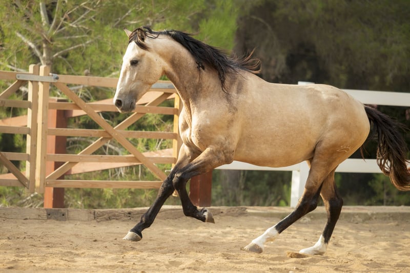 Dieser traumhaft schöne PRE Hengst ist 3 Jahre alt und hat tolle Bewegungen. Er ist Buckskin mit einer weißen Blässe und zwei weißen Stiefelchen. Er hat einen neugierigen, mutigen Charakter und eine tolle Abstammung, welche auch für die Zucht interessant ist. Das Anreiten kann hier gerne vor Ort übernommen werden. Wir betreuen die Pferde hier vor Ort und stehen immer mit Ihnen in Kontakt. Melden Sie sich gerne unter +49 171 528 48 65! Wir haben auch viele andere Pferde, welches “ihr” zu Hause suchen!