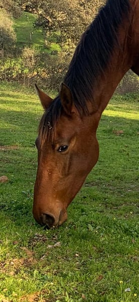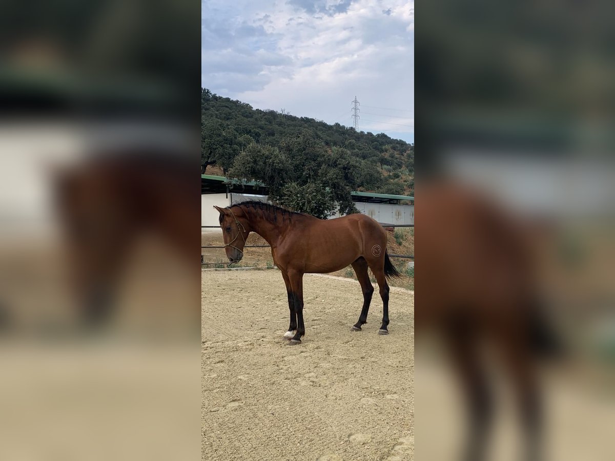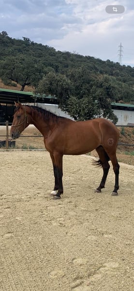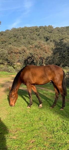 3 year old bay PRE stallion in sport type. Entered in the ANCCE studbook. He transmits the PRL gene, so he will do well in breeding horses with diluted coloured coats. (His sire ROMANCE ABAD is isabela in the last photo). His grandfather on his dam's side is YULIO JEM, passing on great dressage movement, both his siblings and offspring compete in dressage, also internationally with very good results. A horse raised free-ranging 24/7, he has recently been in a stable and has started working from the ground. Eager to work with humans, very good character. Videos in movement on whatsapp. Currently located in Spain.