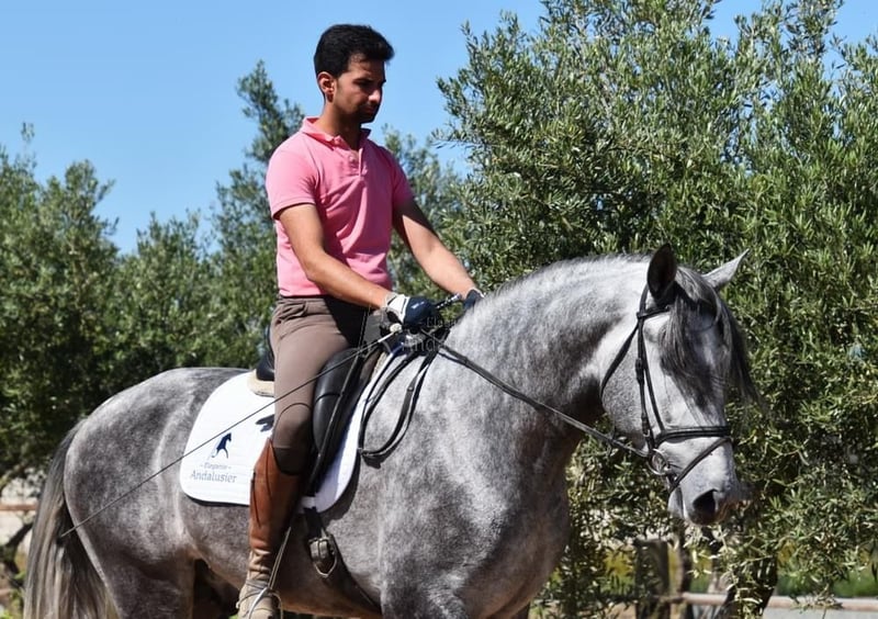 fin karaktär med ett trevligt temperament, nyfiken, något riden i de grundläggande gångarterna, mycket lång, barock, bra rörelser och stamtavla, har redan röntgenstrålar, stamtavla: Gonzalo Valenzuela Ruiz, Marin Garcia, Yeguada Militar, han har flera kvalificerade förfäder www.elegante-andalusier.com