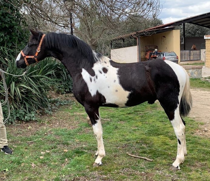 Semental Cruzado de 2 años con capa negro-pinto. PRE X Cuarto de Milla. Tipo barroco y de buen movimiento. En este momento es pasto mantenido 24/7. El caballo tiene pasaporte español y se encuentra en España.