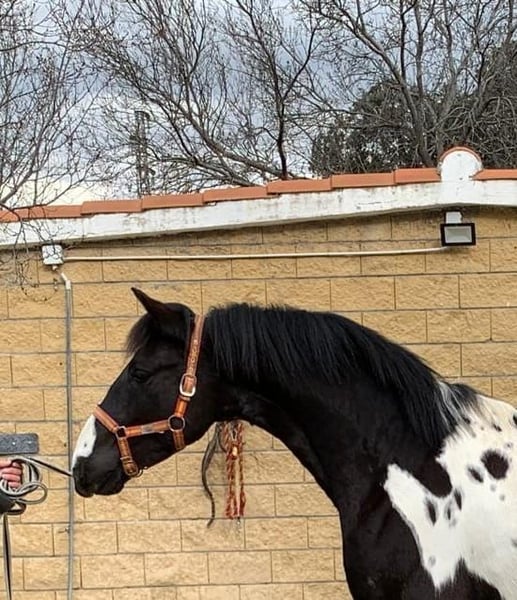 Stallone Cruzado di 2 anni con mantello nero-pinto. PRE X Quarter Horse. Tipo barocco e buon movimento. Al momento è tenuto al pascolo 24 ore su 24, 7 giorni su 7. Il cavallo ha il passaporto spagnolo e si trova in Spagna.