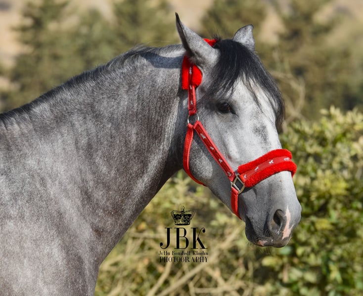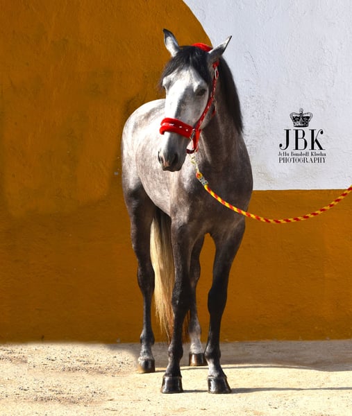 Un gran PRE con excelentes líneas de sangre. Comanche mide actualmente 1,6o m. Nació el 23.05.2021. Su línea de sangre está repleta de ejemplares de distinción. Incluye algunos tesoros criados por Teodoro Herce, ejemplares de Yeguada Lovera y el elitista Educado X del programa de cría de Guardiola. Con Candau y Pallares tenemos líneas Cartujano probadas. Un príncipe de ensueño, este gran joven semental. Su PRE superior se refleja no sólo en sus movimientos, sino también en su carácter. También coopera muy bien, se interesa por todo lo nuevo y no tiene ningún problema en el entrenamiento y el manejo.