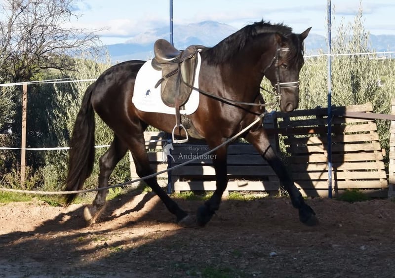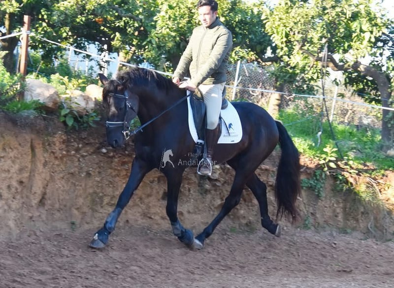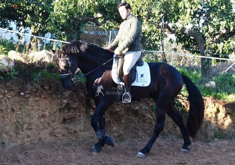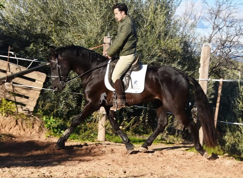 carácter amable y tranquilo, curioso, cariñoso, montado en los aires básicos y en el campo, buenos movimientos, negro con gen PRL, ascendencia: Yeguada las Espadas, Yeguada los Valcanos, Ururopa Laborioso III está calificado www.elegante-andalusier.com
