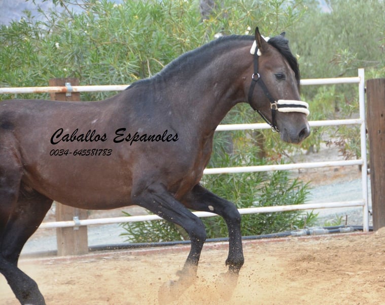 For sale is an impressive PRE stallion, born in 2021. This young dressage prospect stands out with his striking appearance as a dark bay (brunfalbschimmel) and a height of 16.3 hh. His potential in dressage is already clearly evident, and he consistently demonstrates a willing and motivated attitude. With his elegant movement and balanced temperament, he is a true asset for ambitious competitive riders as well as for enthusiasts of this noble breed. This stallion possesses all the qualities to excel in the dressage arena. He has been ridden in basic gaits and always shows a good work ethic and eagerness to learn. Lineage: His grandsire is the licensed stallion Dictador, whose parents are also licensed. If you are interested in this promising horse, we look forward to hearing from you. The horse is being sold on behalf of the owner. He can stay with us for training. A veterinary certificate (AKU) can be arranged at short notice. International transport available.