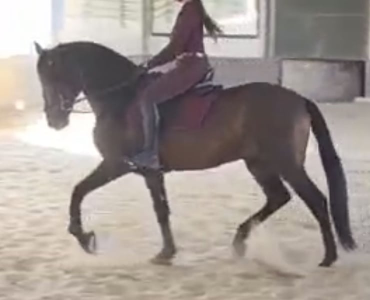 È un stallone PRE baio, quasi 5 anni, con un tipo classico e una presenza espressiva. Si distingue per la sua conformazione armoniosa, le buone proporzioni e la nobiltà tipica della Pura Raza Española. Il stallone è stato già montato e addestrato sotto la sella, dimostrando calma, collaborazione e un carattere orientato alle persone. Lavora con entusiasmo, è piacevole da maneggiare e possiede un temperamento ben equilibrato. Durante la gestione quotidiana si mostra semplice e amichevole. Ideale per cavalieri alla ricerca di un PRE onesto e tranquillo — sia per un ulteriore addestramento in dressage sia per il piacere di cavalcare per svago. Un giovane stallone affascinante, che impressiona sia per il carattere che per l’aspetto fisico. Diretto dal suo allevatore. La madre può essere visitata e il fratellastro si trova in Svizzera. 📍 Località: Spagna 📞 Per ulteriori informazioni, disponibile su richiesta personale (in inglese, tedesco o spagnolo).