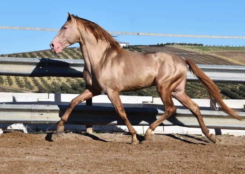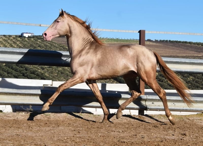 Caractère doux, calme, curieux, joueur et affectueux. Monté en allures de base, adapté à la randonnée. Grand, de style baroque, confortable. Cheval de reproduction, étalon, couleur spéciale. Baya Perla (CrPrl) avec papiers PRE. Radiographies bonnes, Piro négatif. Origines : Antonio Guiral Guarga, Castillo Villafranca, Paco Martí. www.elegante-andalusier.com