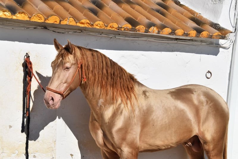 Caractère doux, calme, curieux, joueur et affectueux. Monté en allures de base, adapté à la randonnée. Grand, de style baroque, confortable. Cheval de reproduction, étalon, couleur spéciale. Baya Perla (CrPrl) avec papiers PRE. Radiographies bonnes, Piro négatif. Origines : Antonio Guiral Guarga, Castillo Villafranca, Paco Martí. www.elegante-andalusier.com