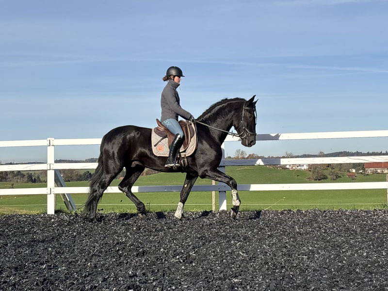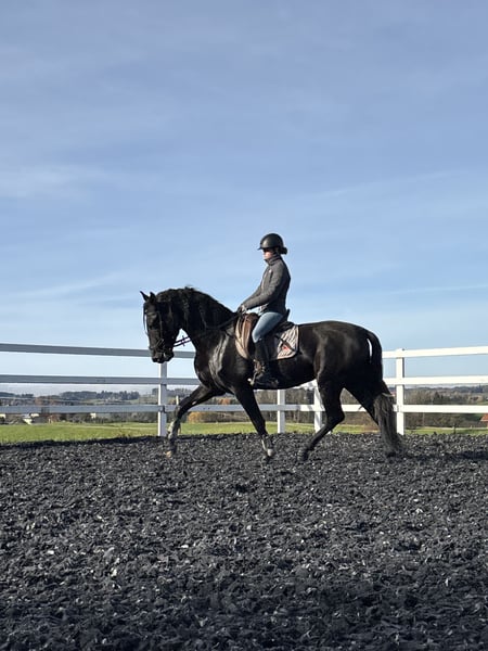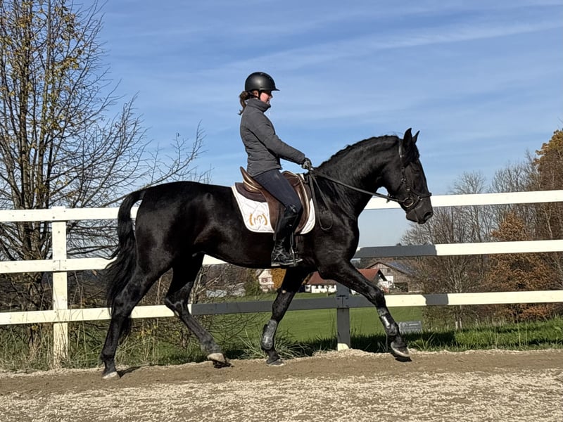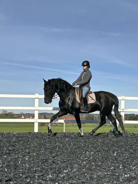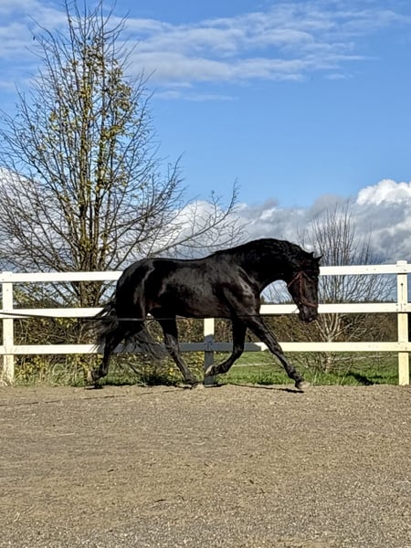 For sale is this exceptional, licensed black stallion, RAHEGO SH. A stunning son of DIVORCIADO from the renowned YEGUADA VALDEOLIVAS breeding program. This extraordinary stallion impresses not only with his size and unique beauty but also with his high-quality basic gaits. His walk is outstanding, his trot mechanics are convincing, and he exhibits a beautiful uphill canter. It is rare to find such movement potential in PREs of this caliber. He has been gently and age-appropriately trained and developed directly by the breeder. RAHEGO SH displays a completely clear mind and is not stallion-like. He possesses a consistently honest character and is a true dream horse. Anyone seeking a soulmate should take a close look at him. Veterinary certificate available, with no notable findings. General information about getting to know our horses: We make every effort to introduce the horses to a trusting riding life. We are happy to present the horses lunged and under saddle. Serious buyers are, of course, welcome to try riding and work from the ground. A viewing fee of 50 euros per visit applies to help us protect our sale horses from the current trend of excessive trial rides. We have found that our horse buyers appreciate that their future horse has not been tried by too many different hands. Thank you for your understanding. You are also welcome to combine your horse search with a few days of vacation. Our cozy holiday apartments directly on the stud farm allow you to get to know the horses around the clock. If you are interested or need further information, I am happy to assist. Please contact me to learn more about this charming leisure mare!