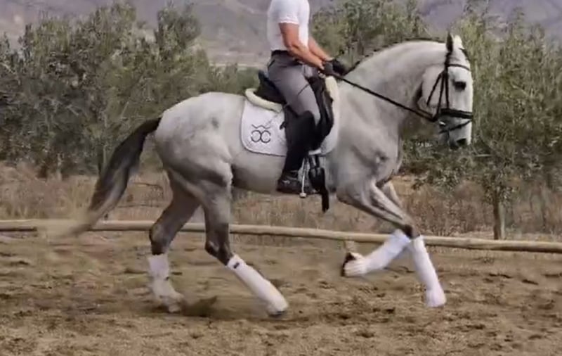 BREED: Pure Spanish Horse (Pura Raza Española) DOB: 2021 Height: 1.68 meters – 16.2 hh Gender: Stallion Level: Basic ridden work, currently being developed with a professional rider. Exhibits excellent behavior, handling, and under saddle. Despite his youth, he responds very well to rider aids and is safe to ride. He does not spook at leg aids and is easy to handle. Currently being lunged for warm-up. Vet check can be arranged upon serious inquiry by interested buyers. Category B €12,000 – €20,000 + VAT within Europe
