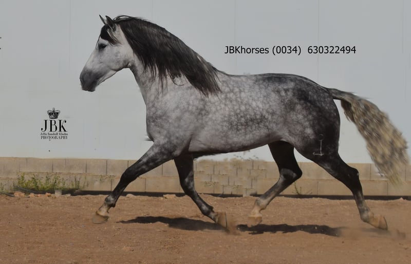 Este magnífico semental PRE del Haras El Ancla nació el 28 de febrero de 2021. Es un ejemplar muy grande de su raza, aunque mantiene un tipo barroco. Valenciano no solo impresiona por su excelente movimiento, sino también por su carácter tranquilo. Es un caballo absolutamente encantador, muy bien educado y que no da ningún problema. En su línea de sangre contamos con dos sementales de élite de la raza: Duque CXIII, de la Yeguada Las Arenas, y Educado X, de la cría Guardiola. Esto habla de su calidad y también se refleja en sus radiografías, que muestran diez estudios sin hallazgos, realizados en octubre de 2025. Además, otros ejemplares de alta calidad de las líneas Bohorquez, El Ancal y Guardiola complementan perfectamente su perfil racial.