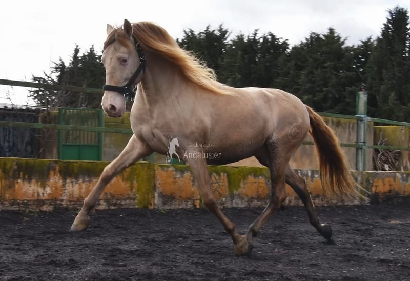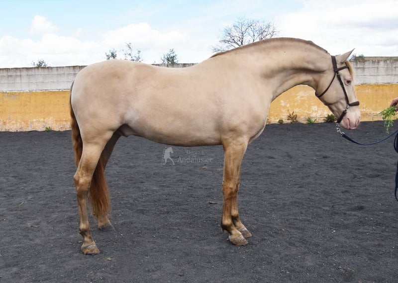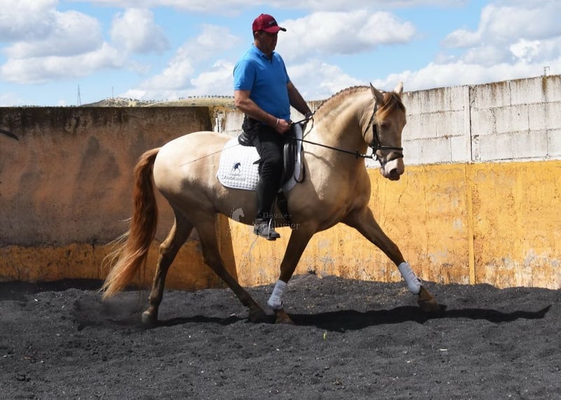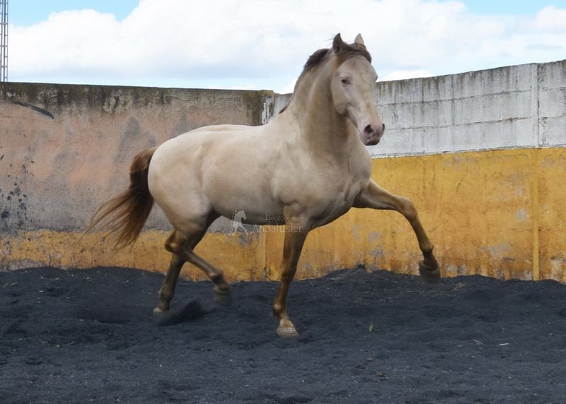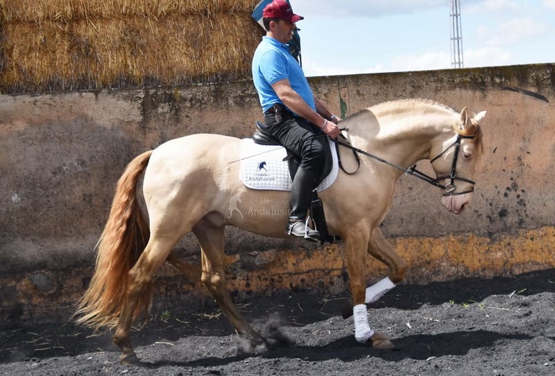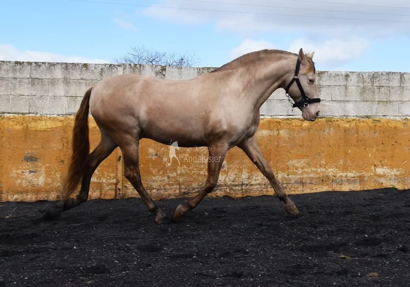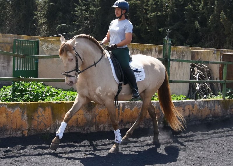 lief karakter, in de basisgangen gereden, Spaanse stap, barok, zeer comfortabel, bankpaard, speciale kleur, PRE Bayo Perla (CrPrl) met papieren, goede bewegingen en afstamming, afstamming: Salvador Miras Gomez, Paco Marti, Yeguada la Llana, Ururopa Gaucho III is gekwalificeerd www.elegante-andalusier.com