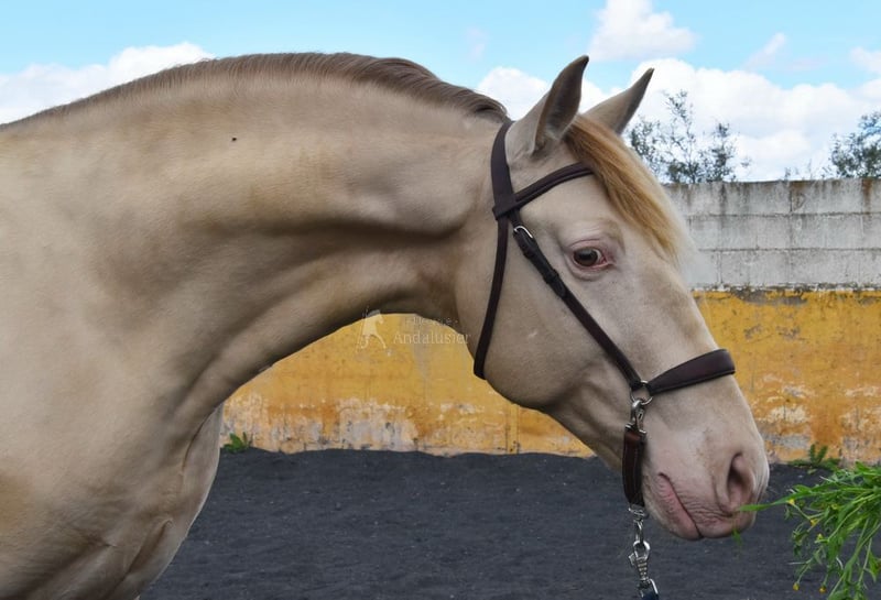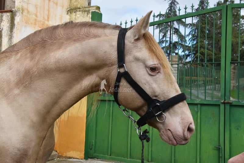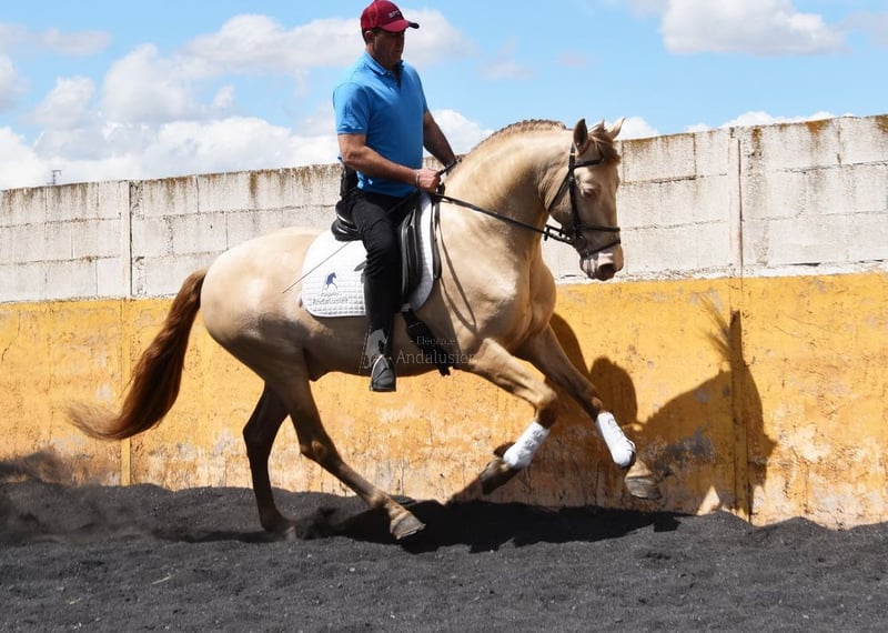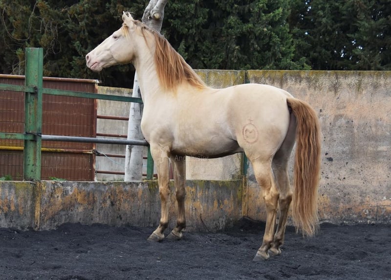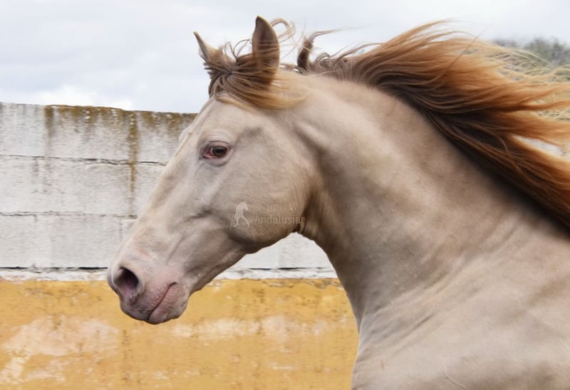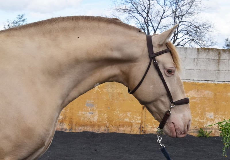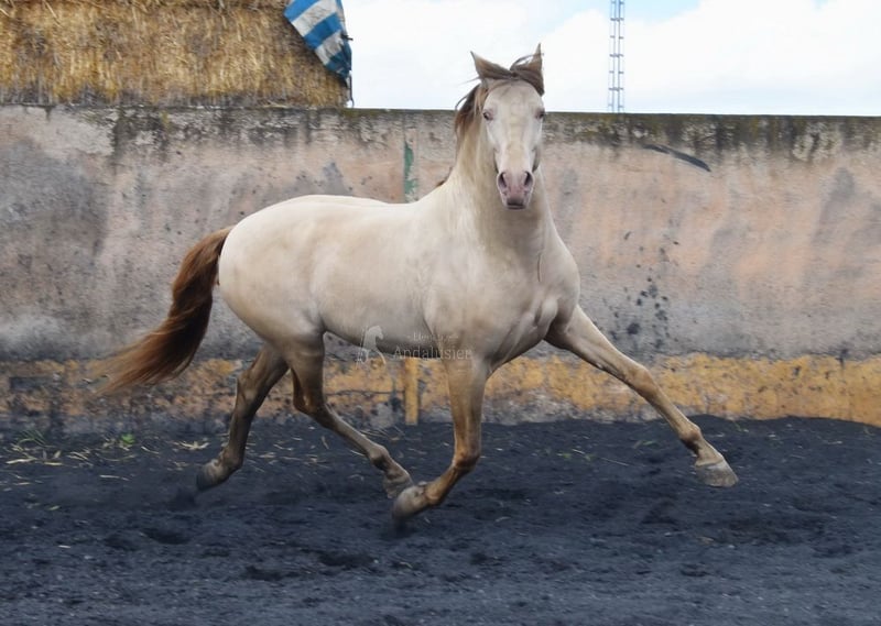 lief karakter, in de basisgangen gereden, Spaanse stap, barok, zeer comfortabel, bankpaard, speciale kleur, PRE Bayo Perla (CrPrl) met papieren, goede bewegingen en afstamming, afstamming: Salvador Miras Gomez, Paco Marti, Yeguada la Llana, Ururopa Gaucho III is gekwalificeerd www.elegante-andalusier.com