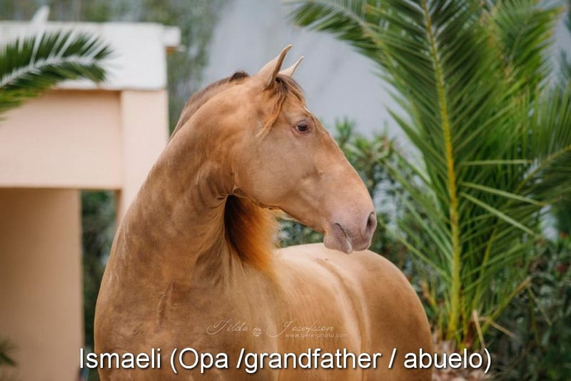 carácter amable, montado en los aires básicos, paso español, barroco, muy cómodo, caballo sofá, color especial, PRE Bayo Perla (CrPrl) con papeles, buenos movimientos y linaje, linaje: Salvador Miras Gomez, Paco Marti, Yeguada la Llana, el tatarabuelo Gaucho III está calificado www.elegante-andalusier.com