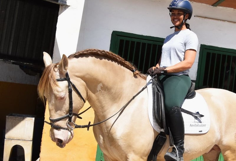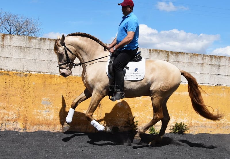 lovely character, ridden in basic gaits, Spanish walk, baroque, very comfortable, sofa horse, special color, PRE Bayo Perla (CrPrl) with papers, good movements and pedigree, lineage: Salvador Miras Gomez, Paco Marti, Yeguada la Llana, great-grandfather Gaucho III is qualified www.elegante-andalusier.com