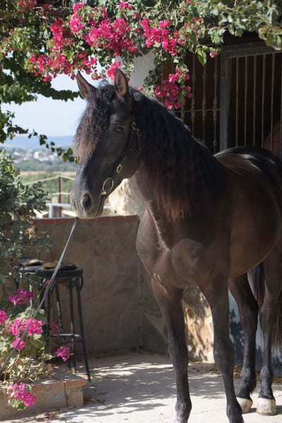 Dieser bildschöne PRE Rapphengst wurde 2020 geboren. Er misst derzeit ca. 1,61m. Schonend wurde er von uns für das Reiterleben vorbereitet. Er wird auf Wassertrense in allen GGA geritten, die Seitengänge, Anfänge Travers, zeigt gute Versammlungsbereitschaft. Freundlich, neugierig, verspielt und menschenbezogen, das beschreibt diesen Junghengst sehr gut. Er zeigt gute GGA mit einem herausragenden Galopp und sehr gutem natürlichen Gleichgewicht und zeigt Talent für fliegende Wechsel Wer einen Rohdiamanten in schwarzer Jacke zum weiter Selbstausbilden sucht, ist hier genau richtig. Er liebt die Freiarbeit, kennt aber auch Stangentraining und die Arbeit an der Hand. Er lernt und versteht unwahrscheinlich schnell. Zu Hause ist er in einer großen Paddockbox mit direktem Kontakt und Anschluss zu anderen Pferden, auch Hengsten. Er ist gewöhnt an laute Maschinen und Fahrzeuge, freilaufende Hühner, Kühe, Hunde und vieles mehr. Röntgenbilder aus 2022 sind vorhanden. Er ist Piro negativ, geimpft, regelmäßig entwurmt sowie dem Schmied vorgestellt. Auf Wunsch kann er vor Ort gelegt werden. Natürlich kann er noch zur weiteren Ausbildung bei uns bleiben. Bei ernst gemeintem Interesse leite ich gerne weitere Informationen weiter. Wir sprechen Deutsch, Englisch und Spanisch. Alle Preise verstehen sich ohne MwSt. und ohne Transport!