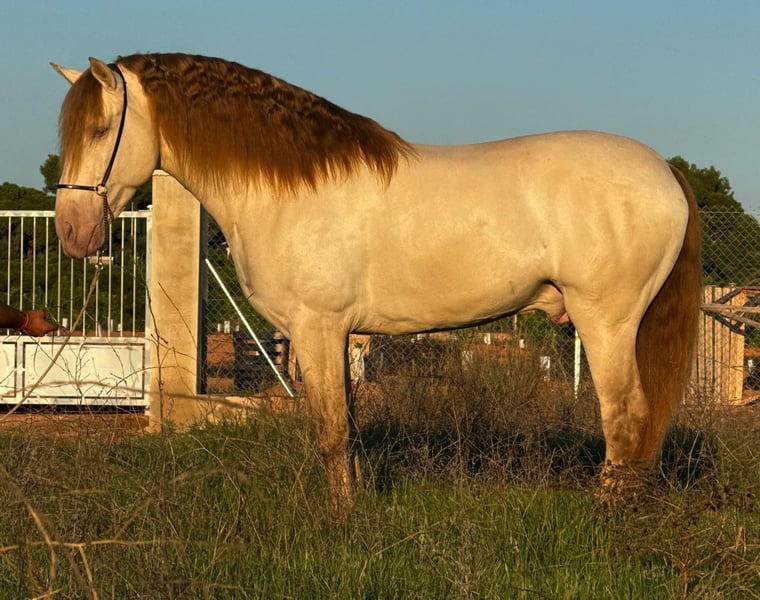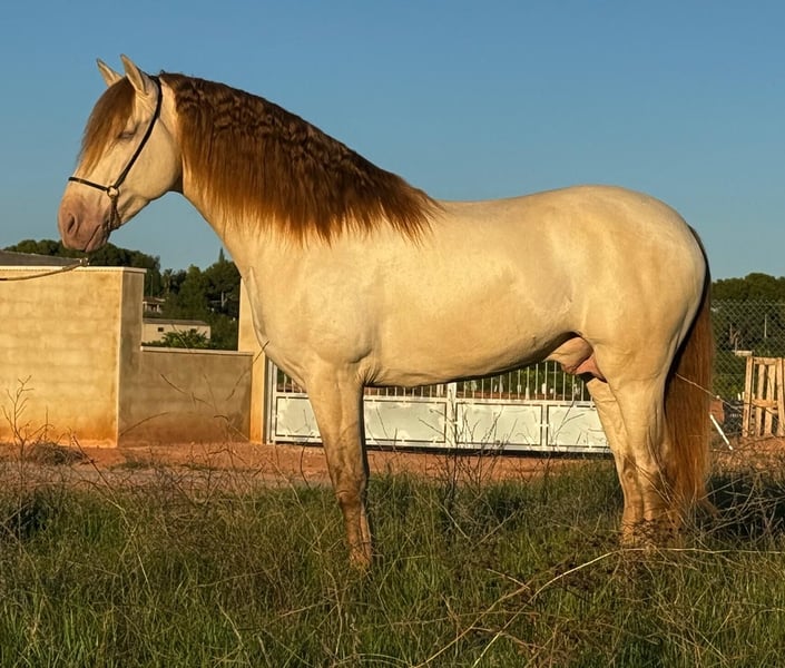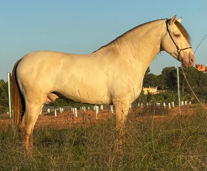 IMPERIO: ULTRA-ROBE AND GENTLE PRE IN RARE CHAMPAGNE COAT COLOR / ULTRA-ROBE AND KIND PRE IN CHAMPAGNE HUE Breed: Pure Spanish Horse (ANCCE) Gender: Stallion Year of Birth: 2020 Height: 15.7 hh (1.60 m) Training: Well-ridden / Under saddle Location: Spain – Valencia - Fully vetted with all X-rays Worldwide shipping available! For more information about this exceptional young horse, contact us via WhatsApp at +34 622 509 702. We speak German, English, and Spanish.