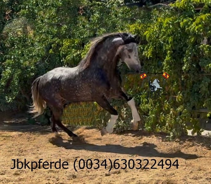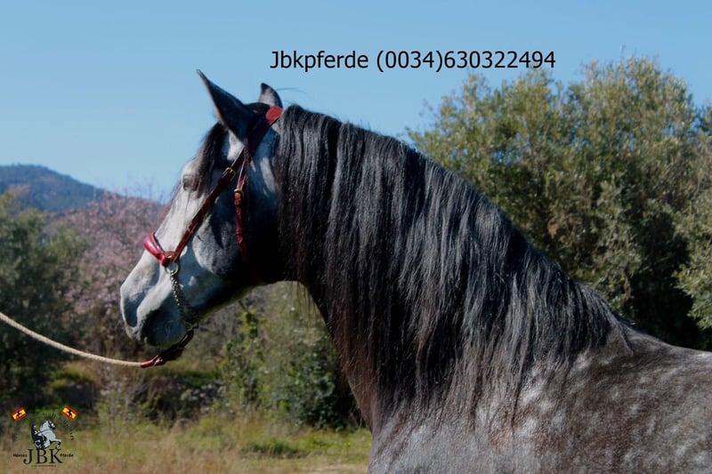 Mit PRE Hengst Icaro haben wir ein Exemplar aus den Cartujano Linien. Er wurde am 06/01/2020 geboren und ist derzeit 1, 62 m gross. Icaro ist sehr gut erzogen, diszipliniert bei der Arbeit und er hat ein waches Köpfchen und lernt sehr rasch. Seine Vorfahren entstammen den Gestüten Salvatierra, Novales, Terry, Los Callejones del Duende, und sein Vater Mensajero XX II enstammt dem Gestüt Valdeoliva. Mit aktuellen Röntgenbildern ohne Befund.