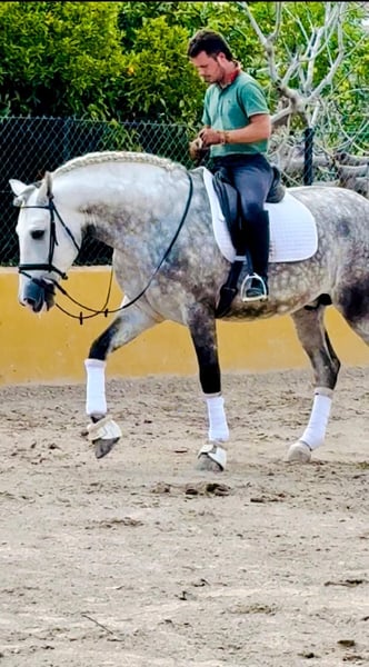 Outstanding stallion PRE from 2020 with the most reliable and famous bloodlines in the SPANISH HORSE WORLD, he is a horse to keep forever and compete in the higher levels for his quality movements and bloodlines. He is for sure a WIN TO WIN. He stands in the 1M70 size and could grow little bit more he is just a big baby. He is working towards levels with eager and willing behavior and giving always his best to please the rider and owner. Suitable for all family, kids and adults. It's a horse to enjoy being around people, has not bad behavior or vices that needs to know. He is working really good the basic with smooth transitions, easy disposition to work, lateral work, half passes, extended trot, piaffe and collecting are being his best.