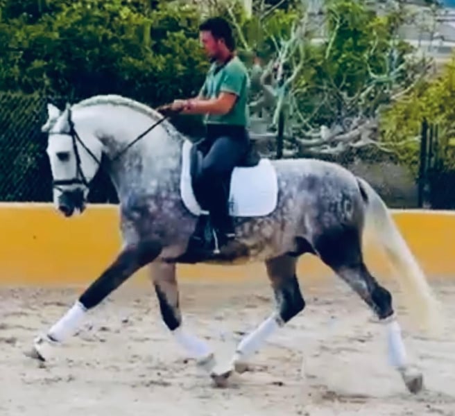 Outstanding PRE stallion born in 2020, boasting some of the most reliable and renowned bloodlines in the Spanish horse world. He is a horse to keep forever and compete at higher levels, thanks to his exceptional movement quality and prestigious lineage. He is truly a WIN TO WIN. Standing at approximately 1.70 meters (16.1 hh) and still growing, as he is just a big baby. He is working towards higher levels with eager and willing behavior, always giving his best to please the rider and owner. Suitable for all the family, including children and adults. This is a horse that enjoys being around people, with no bad habits or vices to worry about. He is progressing very well in basic training, demonstrating smooth transitions, an easy disposition to work, lateral movements, half passes, extended trot, piaffe, and collection—all of which are his strong points.