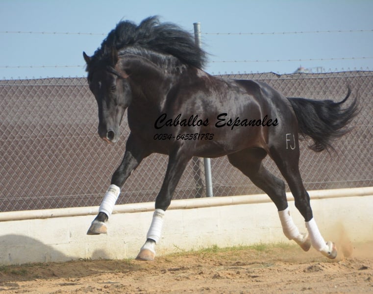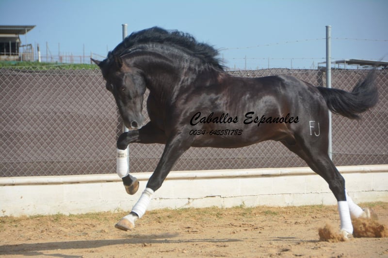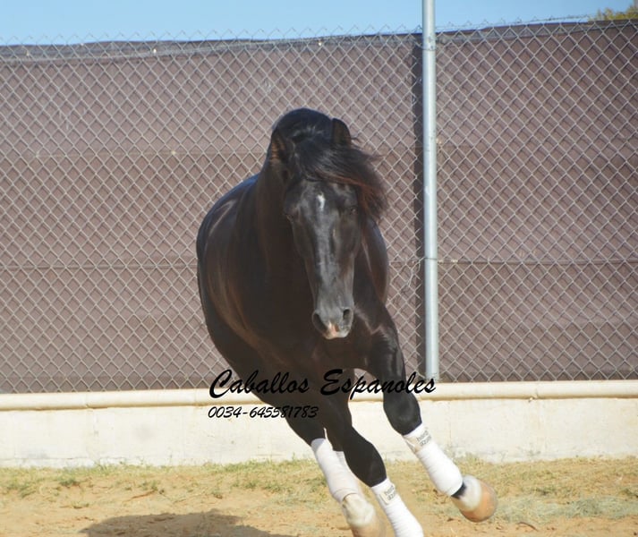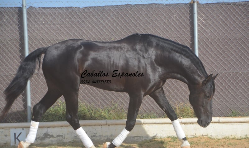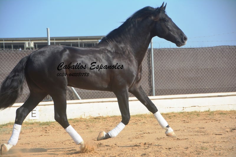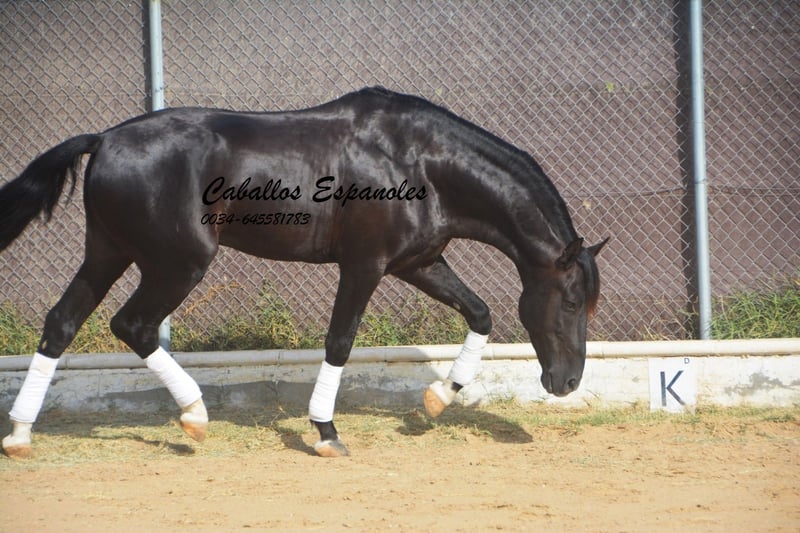 Magnifique étalon PRE bai, construit de manière correcte avec une apparence baroque. L'étalon est très bien dressé, il marche calmement à côté des juments. Le bai est solide dans ses allures de base, avec des passages latéraux et un pas espagnol. Il travaille actuellement sur la piaffer et les changements de galop. Ascendance : Boloix, Bocado Le cheval est vendu pour le compte du propriétaire. Il peut rester en pension chez nous si souhaité. Une échographie complète sera organisée rapidement. Transport international possible.