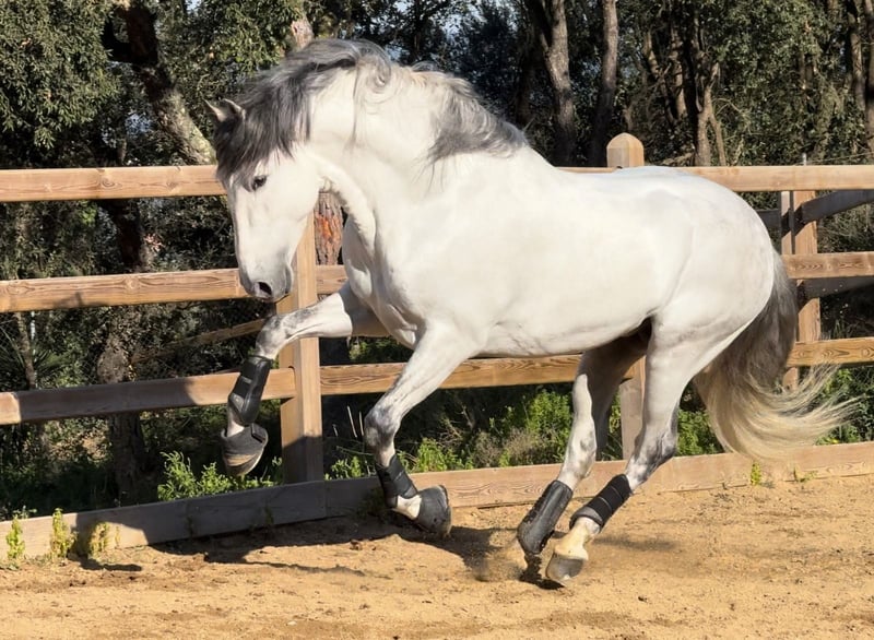 Registered PRE with ANCCE – full papers available + PYRO FREE This striking grey PRE stallion, born in 2019 and standing 164 cm, combines classic Andalusian elegance with genuine athletic ability. He presents a refined, correct conformation, expressive yet balanced movement, and a calm, cooperative temperament that makes him a pleasure to work with. Bred in the traditional PRE type but developed for modern dressage, he shows natural collection and already understands piaffe and passage, highlighting his strength, balance, and willingness to perform. His rideability and sensible attitude make him suitable not only for professional training but also for confident amateurs looking for a quality partner. Whether your goal is competitive dressage or a distinguished horse to develop further, this stallion offers a rare combination of talent, character, and presence. A refined and promising PRE with both the mind and ability to progress.