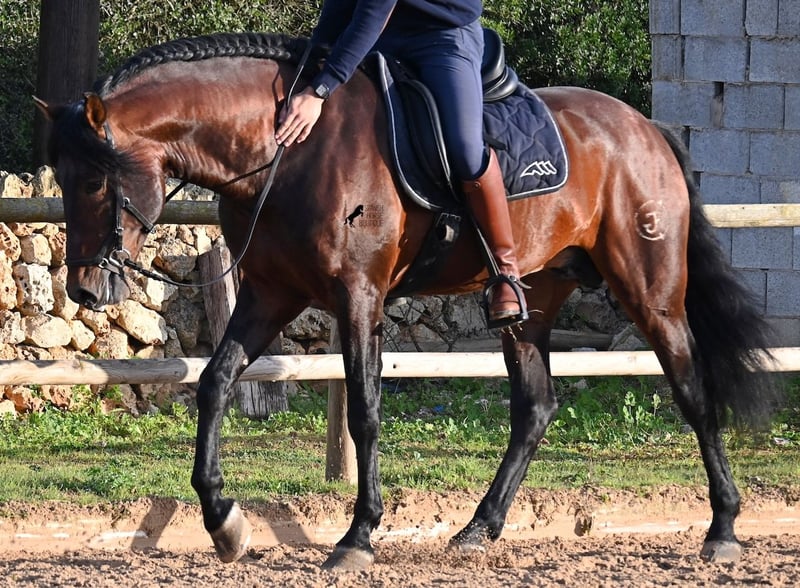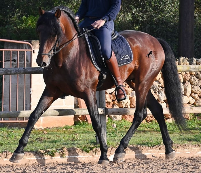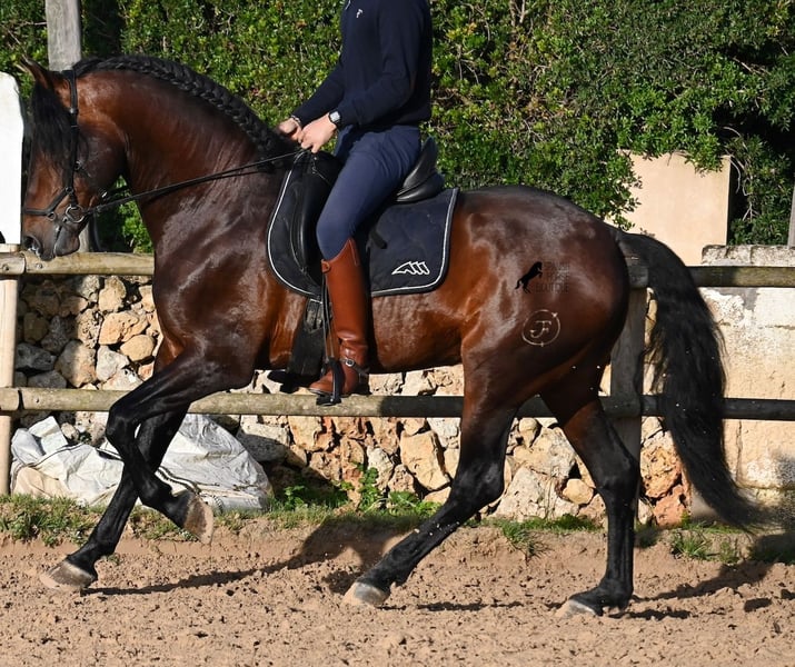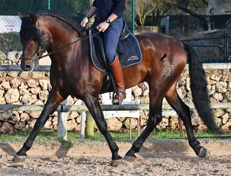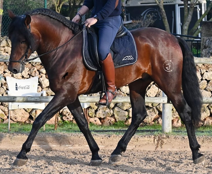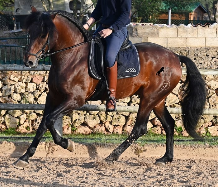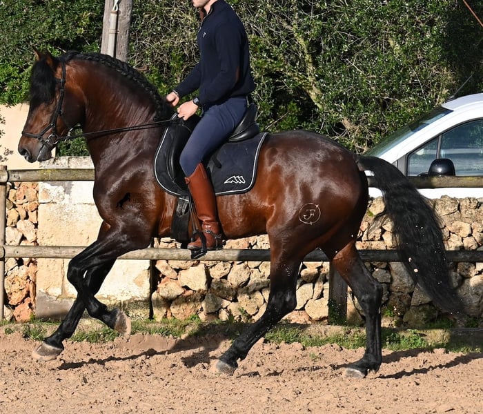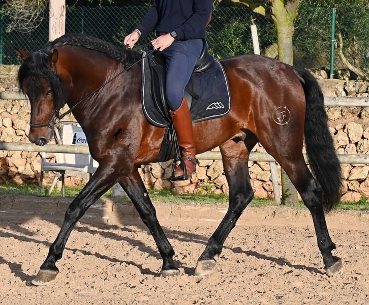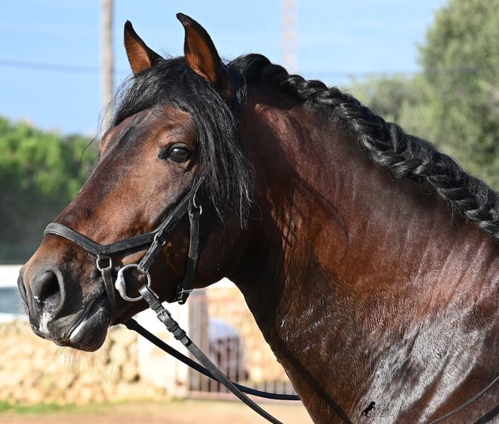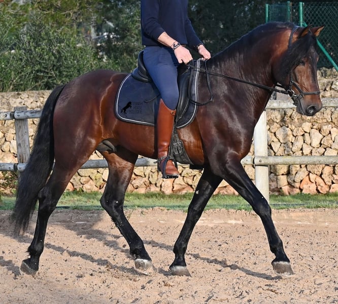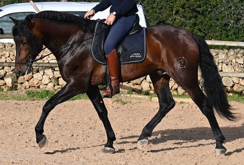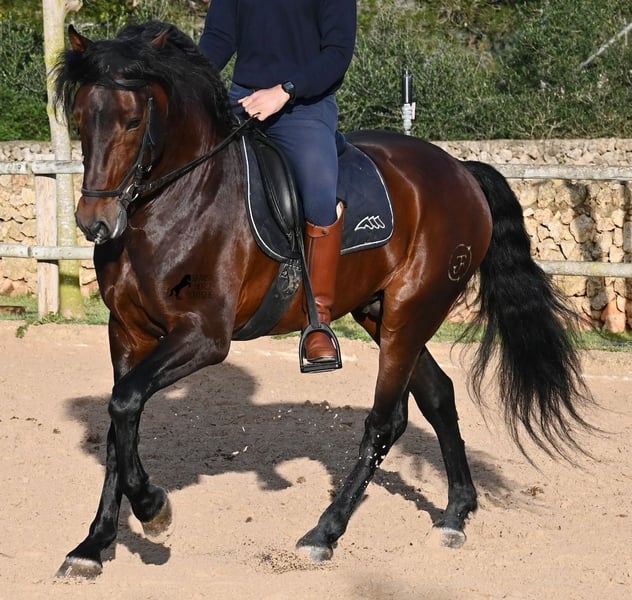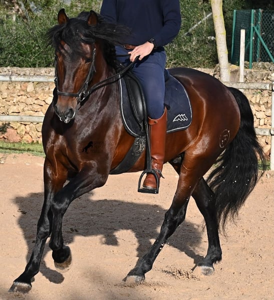 Este caballo PRE nacido en 2019 (Andaluz con certificado de raza de la ANCCE) es un ejemplar de belleza excepcional en muchos aspectos. Su belleza exterior es evidente, pero su carácter amable, su voluntad de trabajo y su disposición a complacerlo también lo convierten en un alma hermosa por dentro. Es increíblemente bien educado, tanto en el manejo como bajo la silla. Siempre atento para hacer todo correctamente y con una perseverancia incansable para agradar. Su entrenamiento es muy sólido; domina trabajos laterales en todas las disciplinas de doma clásica y es muy flexible y suave, lo que también lo hace interesante para la Working Equitation. Entre trabajo y descanso, distingue rápidamente y pasa con gracia de la recogida a la extensión y elongación. Es un caballo muy inteligente, con potencial para más, ya que actualmente solo es montado dos veces por semana por su entrenador, y aún así muestra resistencia, calma, concentración y buena forma física. Ha participado en alguna competición, por lo que también está familiarizado con estar en lugares nuevos junto a otros caballos. No presenta comportamiento de semental y, en la pista, se mantiene tranquilo y concentrado con otros caballos. Aunque se han hecho menos paseos, también los ha realizado en grupo y en solitario. Su linaje es también interesante para conocedores de PRE, ya que por parte de padre proviene íntegramente de Yeguada Militar (Cartujano) y por parte de madre, principalmente de Escalera. Actualmente mide 1,66 m y puede que aún crezca un poco más. Está aprobado y no ha sido utilizado para reproducción. Para quienes no puedan tener un semental, existe la opción de castrarlo en el lugar. Su ubicación actual es Menorca. Videos y pedigrí disponibles bajo petición. Con gusto puedo organizar una revisión veterinaria, entrenamiento, castración, transporte o incluso su viaje si desea venir a verlo en persona. Para más detalles, puede consultar mi página o contactarme directamente. Saludos desde España