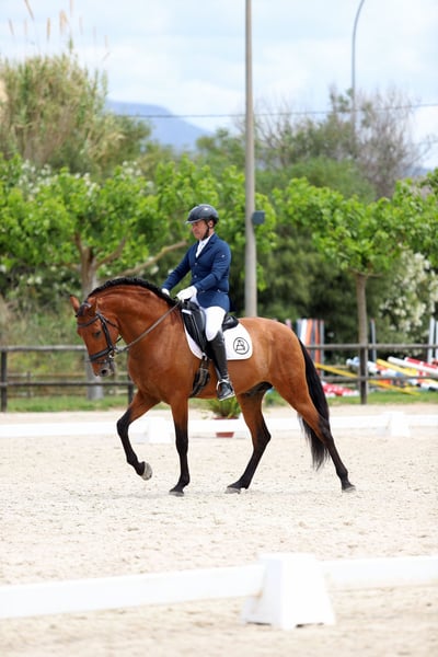 Caballo castaño limpio nieto del semental élite Educado con movimientos, morfología y un carácter extraordinario. Nada de caliente, esta concentrado en su trabajo y esta domado por un jinete profesional. Siempre era muy bien cuidado. El nivel de doma es de 3 con éxito. Preparado para salir en nivel 4