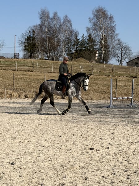 I offer for sale a beautiful Andalusian stallion with very good movement in all three gaits. Bombproof. Wonderful character. Very good head. Learns quickly. The horse performs flying changes, leg yields, and shoulder-in. Healthy. Easy to handle (shoeing, grooming). An ideal prospect for a dressage horse or working equitation. I highly recommend it.
