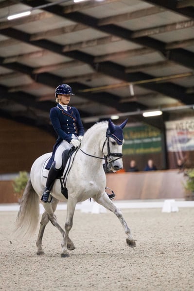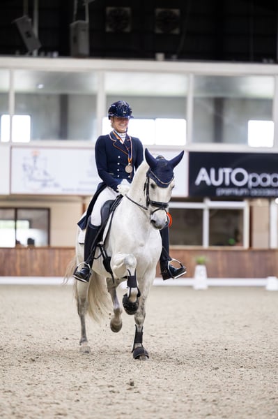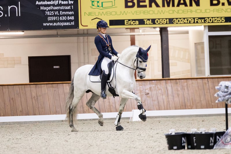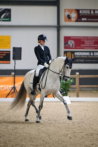 Elias Torreluna è un bellissimo stallone grigio dal carattere dorato. Elias è un cavallo che ruba subito il cuore con le sue coccole, la sua bella criniera lunga e il suo splendido bagliore argentato. Ha 3 andature molto buone. Possiede una buona camminata, un ottimo trotto con un'ottima gamba posteriore e un canter in salita che è facile da chiudere, è super piacevole da cavalcare e ti dà davvero una sensazione di meraviglia. Elias è un cavallo adatto sia a cavalieri ambiziosi che a cavalieri alle prime armi. Elias è classificato a livello Z2 ed è addestrato a livello ZZ-light. Ha molto talento per il passaggio piaf. Amzone è alto 1,78. Il cavallo Elias Torreluna della NL Stables ha già ottenuto molti bei risultati con la sua giovane età. Ai campionati olandesi dei giovani cavalli MCI 2023, è diventato campione di riserva con un punteggio medio dell'86%. Questo stallone PRE ha fatto buoni affari anche ai Campionati Europei di Parigi, riuscendo a vincere la prima classe dei giovani cavalli e ottenendo una medaglia di bronzo assoluta in questa classe. Nel percorso di selezione per i Campionati Europei MCI 2024, Elias è diventato campione olandese con un punteggio del 73% nel test e del 77% nel livello 2 del Freestyle. Questo lo qualifica nuovamente per i Campionati Europei MCI 2024 di Exloo. Qui ha conquistato il titolo di campione europeo di riserva di Siviglia e ha vinto l'oro a squadre per la seconda volta consecutiva, oltre all'argento individuale. Oltre ai suoi successi sul ring all'MCI, Elias ha ottenuto buoni risultati anche nelle competizioni KNHS. Ha all'attivo diverse vittorie tra i warmblood in Z1 con punteggi intorno al 68% e in Z2 con punteggi intorno al 67%. Elias è arrivato quarto in Z2 ai campionati indoor KNHS 2025. Elias proviene direttamente dall'allevatore Yeguada Torreluna, completamente approvato, compresi collo e schiena.