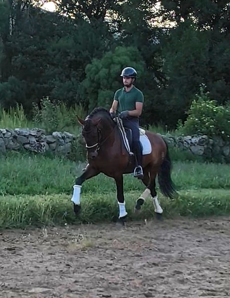 P.R.E. con buena morfología. Predisposición para la doma clásica. Tiene buen carácter y es agradable de montar. Actualmente hace todos los ejercicios de San Jorge. Adecuado para cualquier jinete. Con capacidad para seguir evolucionando en la doma. Libre de piro. Para ver video contáctanos