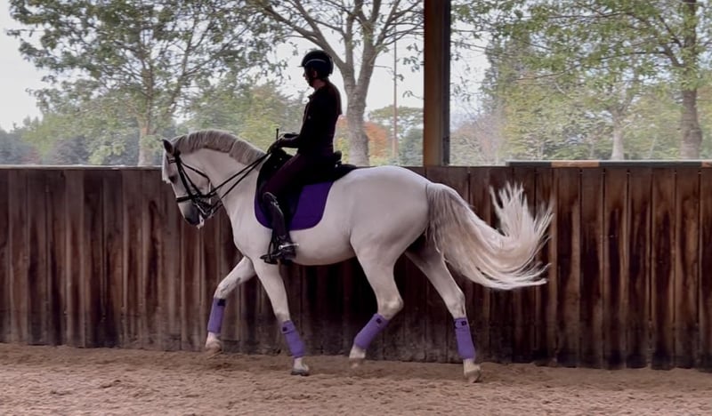 This stallion is well-behaved in handling, under saddle, and around other horses. Performs simple traversals and piaffe with ease. Light-footed and easy to sit. Piro-free. Current health certificate available. For more information, please contact me via email.