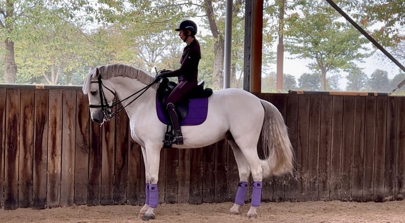 Este semental es tranquilo en su trato, bajo la silla y entre otros caballos. Realiza transiciones simples de paso y piaffe. Es de fácil galope y sencillo de montar. Libre de Piro. La documentación actual está disponible. Para más información, no dude en contactarme por correo electrónico.