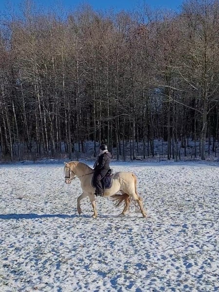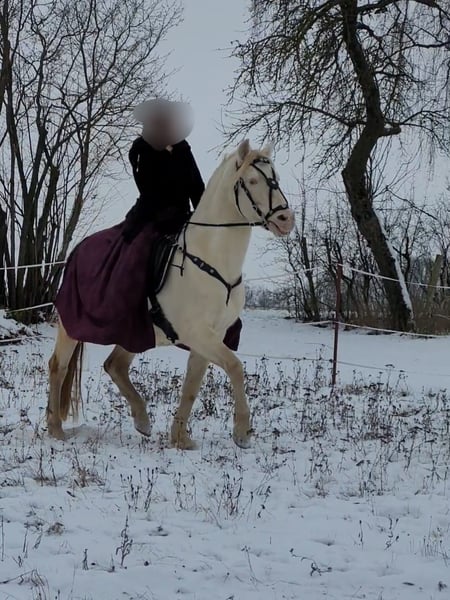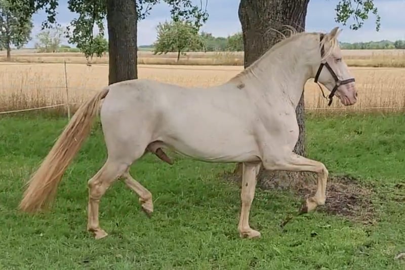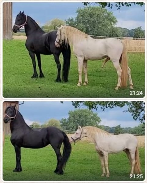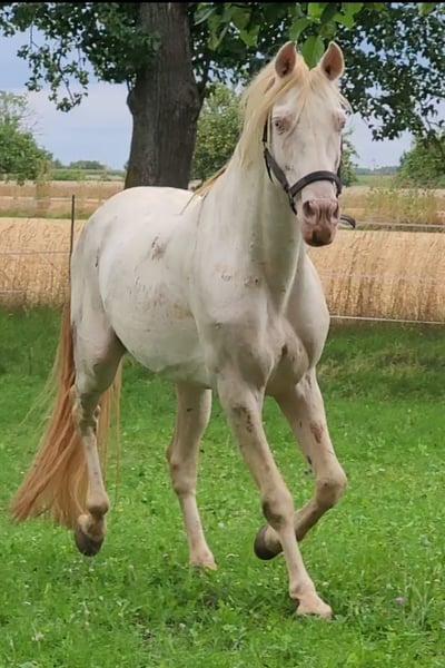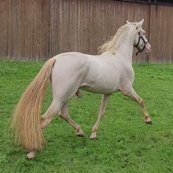 Für die Zuchtsaison 2026 stellen wir unseren PRE Hengst Leo einigen ausgewählten Stuten (alle Rassen) im Natursprung zur Verfügung. Leo ist ein Perlino (ggEEAACrCrnd1nd2), d.h. er vererbt unabhängig von der Basisfarbe der Stute ausschließlich Buckskin bzw. Perlino Fohlen, (je nachdem ob die Stute auch Creme Gen trägt oder nicht). Als Träger von nd1 (Pseudo Dun) kann er zu 50 % auch einen Pseudo-Aalstrich weitergeben. Leo ist gekört beim ANCCE. Fohlen aus PRE Stuten erhalten volle ANCCE Papiere. Er ist negativ getestet auf die üblichen Erbkrankheiten: PSSM1, GBED, HERDA, HYPP, MYHM, MH. Leo überzeugt vor allem durch seinen enorm liebenswerten Charakter. Er ist absolut klar im Kopf und auch in Gegenwart von Stuten, anderen Hengsten oder Wallachen stets gut händelbar. Zudem ist er fein zu reiten, lernwillig, kooperativ und noch dazu extrem sitzbequem. Leo deckt ausschließlich im Natursprung an der Hand. Er deckt trotz Stm 1,52 m Stuten bis mindestens 1,65 m locker ab (unsere Stute ist 165 cm, siehe Collagebild, ist tragend geworden). Aufgrund seiner Größe eignet er sich auch für kleinere Stuten und Ponyrassen. Stuten brauchen negative Tupferprobe, gültige Haftpflichtversicherung und dürfen hinten nicht beschlagen sein. Soweit wir das recherchiert haben, können Fohlen aus folgenden Stuten theoretisch Papiere erhalten, wenn alle Voraussetzungen passen: - PRE (= PRE) - Lusitano (= Cruzado Iberico) - Friese (= Warlander) - Quarter Horse (= Azteca) - Warmblut (= Spanisches Sportpferd) - Scheckstuten (= Pinto) - Welsh Cob (= Leonharder, Zuchtbuch) - Haflinger (= Leonharder, Fohlenbuch)
