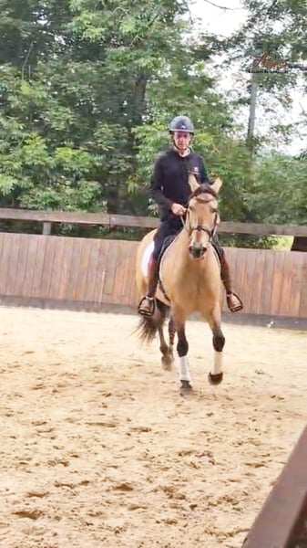 Dolar JC, 10 jaar oud en 1,63 m hoog. Zijn IGG werd beoordeeld op 107% tijdens een conformatieconcours in Spanje. Zijn moeder komt uit de beroemde fokkerij Peralta! Naast zijn afkomst toont Dolar een echte natuurlijke aanleg onder het zadel. Goed getraind, beheerst hij de haute école-verschijningsvormen: piaffe, passage, changement de pieds op twee tempi, Spaanse pas en pirouette-approach. Hij is een gevoelig en charmant paard, gul onder het zadel en nieuwsgierig naar interactie. De ideale sportpartner voor een ruiter die zijn dressuur wil perfectioneren en tegelijkertijd een exclusieve band wil opbouwen met dit delicate, verfijnde en expressieve paard. Zijn röntgenfoto's zijn perfect en op aanvraag beschikbaar. Net als alle paarden die bij Alegria komen, is Dolar opgeleid volgens het Relatie van Verbondenheid®-curriculum, onze educatiemethode die veiligheid en rust garandeert. U kunt hem nu reserveren en zijn ontwikkeling verder volgen met onze begeleiding op het landgoed of via onze online training. Prijs op aanvraag, afhankelijk van de opleiding van het paard.